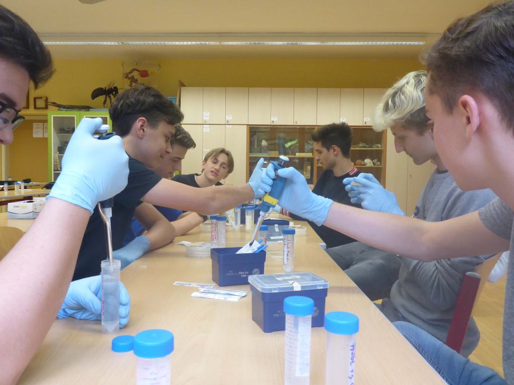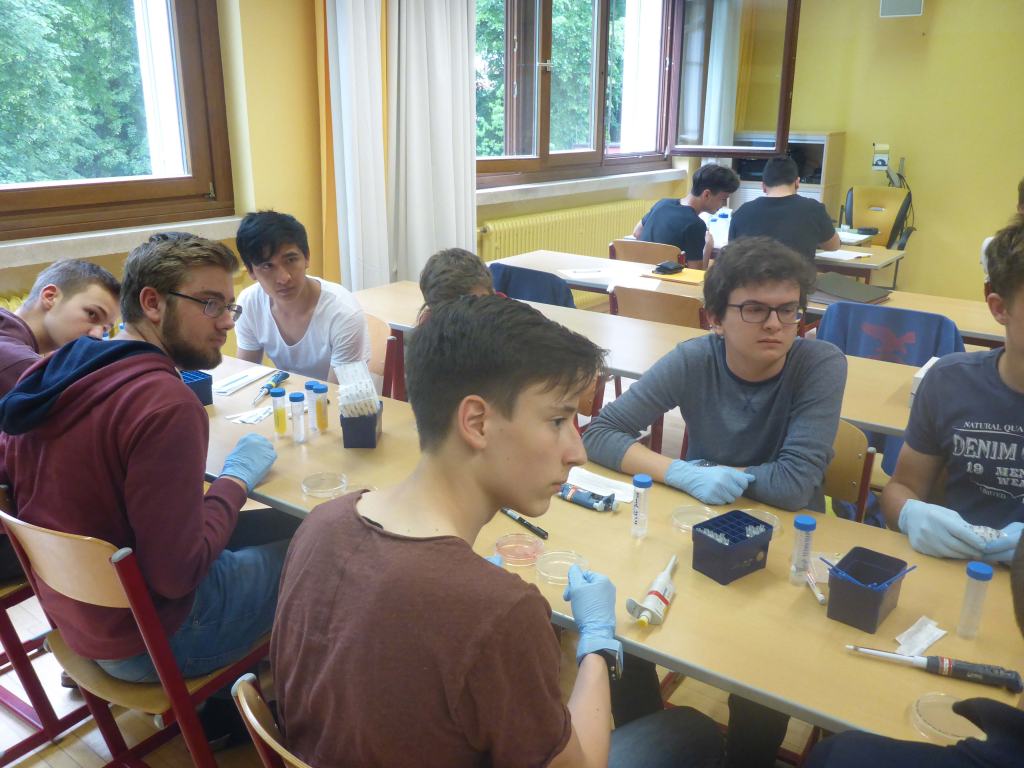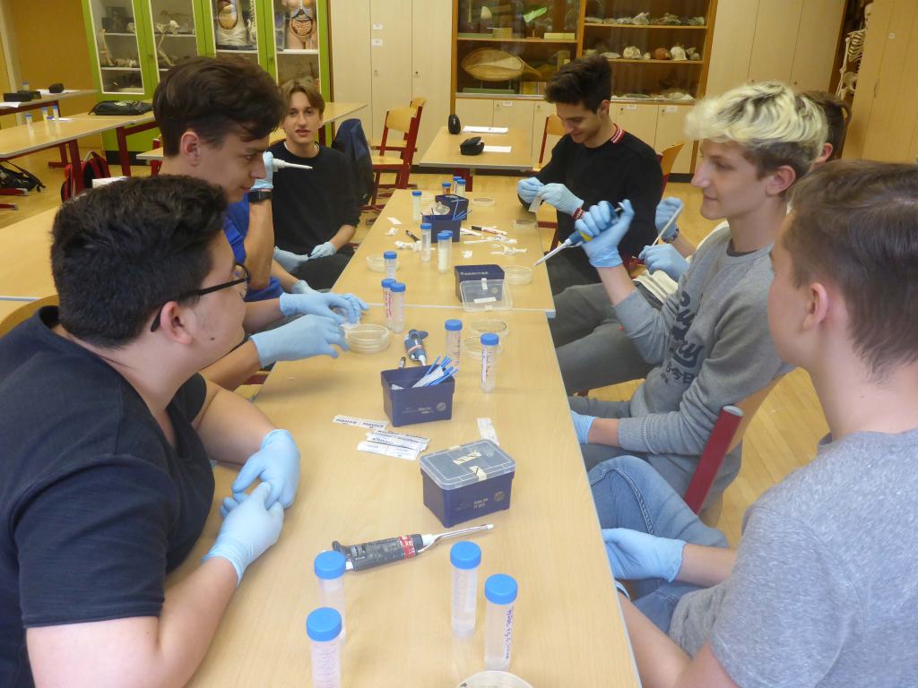 Am 16.5. war das Projektteam am Gymnasium der Herz-Jesu-Missionare in Salzburg, Liefering zu Gast. Zuerst gab es einen Vortrag zum Projekt und eine Einführung in das mikrobiologische Arbeiten im Klassenzimmer. Dies wurde auch gleich angewandt, indem mitgebrachte Proben auf Agarplatten ausgestrichen wurden. Jeder hatte eine flüssige Probe mitgebracht, in der er Bakterien vermutet und eine, in der keine Bakterien vermutet werden. Da war dabei: Wisky, Leitungswasser, Milch, Blut, Regenwasser, Bachwasser und einiges mehr.