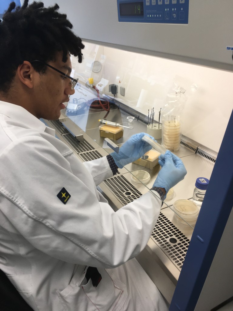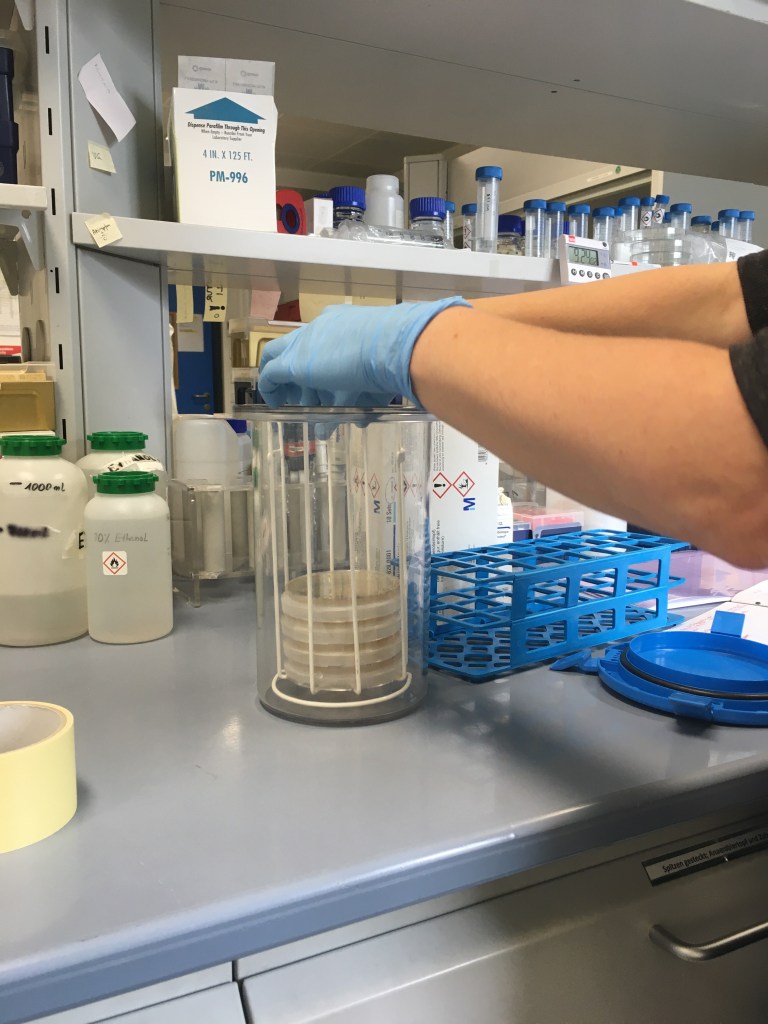 Zum Beginn der neuen Woche, war Dr. Hahn mit uns auf einer Probennahme zum Löckermoor und auch hier wurden wichtige Werte, wie pH, usw.… gemessen und aufgeschrieben. Danach wurden die Proben im Labor in Wells gefüllt, wo die Bakterien im Laufe der Woche an das sehr nährstoffreiche NSY-Medium gewöhnt werden sollen. Die Platten der Vorwoche wurden untersuchten wir auf rote bis orange-rote Kolonien, ausgewählte Kolonien wurden in Wells übertragen. Der nächste Tag bestand vorerst nur aus alltägliche Laborarbeiten, während wir am Mittwoch wieder damit beschäftigt waren, Wells zu füttern und weitere interessante Kolonien von den Platten in Wells zu übertragen. Donnerstags haben wir angefangen DNA, mithilfe eines Kits zu isolieren. Das hat einen ganzen Vormittag gedauert, der Großteil des Ablaufs war nur Zentrifugieren, abpipettieren usw. Abgeschlossen haben wir die Woche, mit dem Übertragen der schon angewachsenen Kulturen aus den Moor-Wells, auf Platten und dem Überführen neuer Kolonien von den Platten in Wells. Natürlich haben wir das Ganze auch noch dokumentiert. Die ersten 10 Tage haben uns prima gefallen und wir freuen uns schon auf die Kommenden. Einen Tipp, den wir an alle geben könne die auch ein Praktikum machen wollen ist: Geht zeitig ins Bett, man braucht viel Konzentration ;).