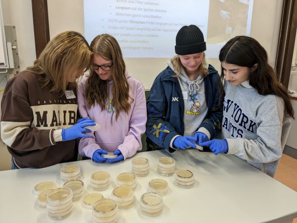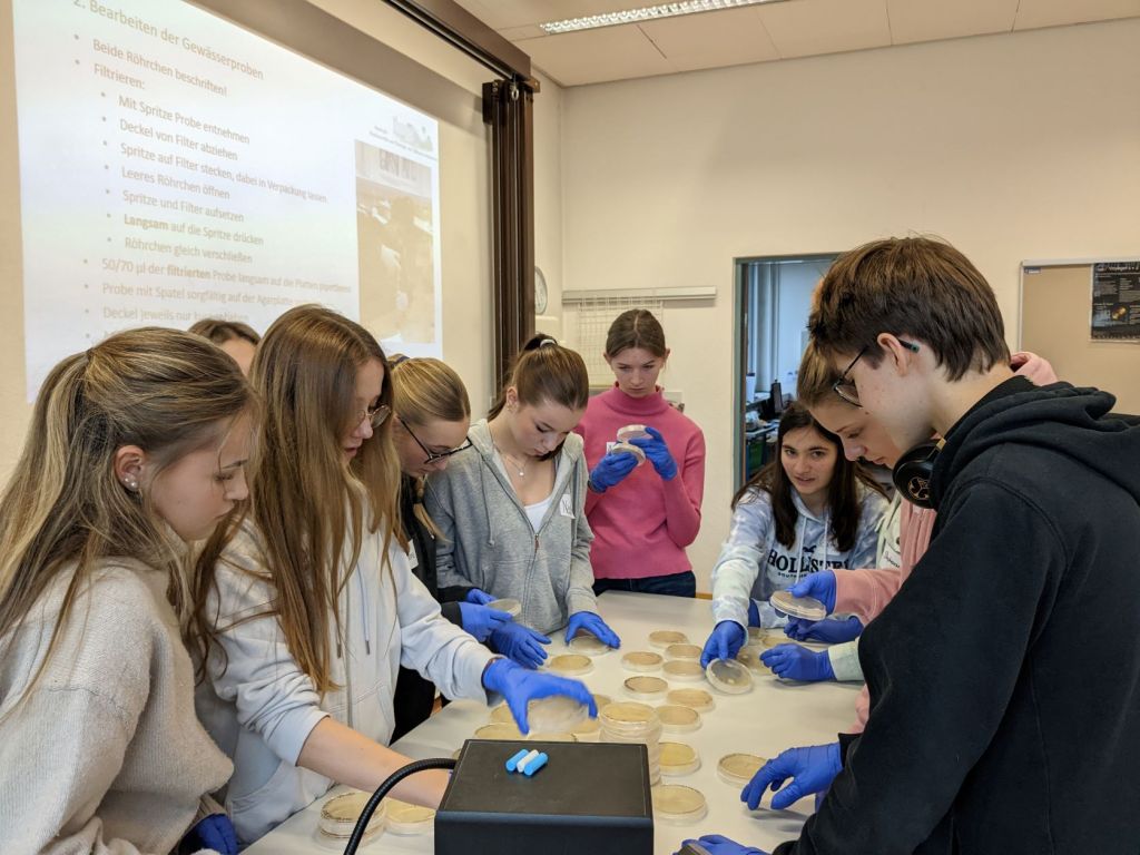 Dann kamen wir zum wichtigsten Teil, dem Filtrieren und Ausstreichen der mitgebrachten Wasserproben. Das ging nun wirklich sehr gut, da hatte sich die Übung aus dem vorherigen Workshop bezahlt gemacht. Wir sind sehr gespannt darauf, was auf den Platten so wächst. Die ausgewählten Gewässer sehen auf alle Fälle sehr interessant aus.