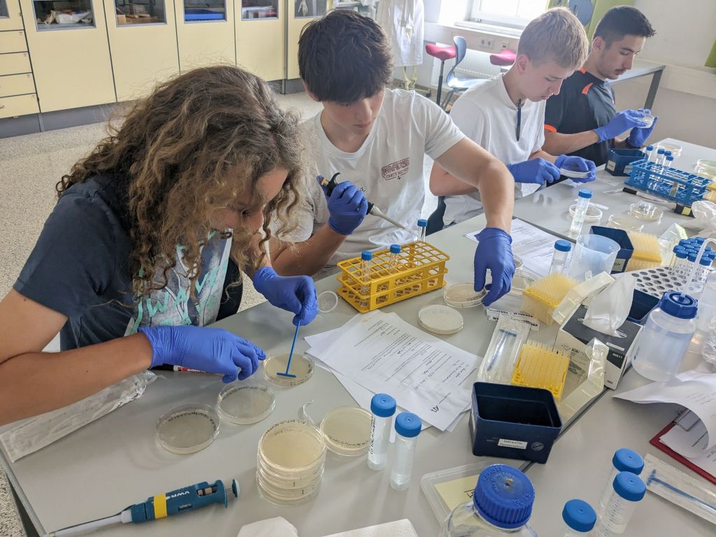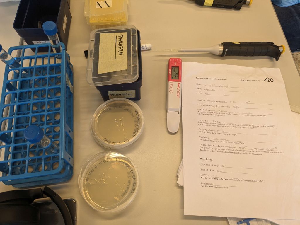 Dann ging es daran die Agarplatten vom ersten Workshop zu begutachten. Das Parfüm war wohl schon etwas älteren Datums, denn es waren einige Bakterienkolonien auf den Platten gewachsen. Auf den sonstigen Agarplatten mit Flüssigkeiten, die hauptsächlich aus Alkohol bestehen, war nichts oder fast nichts zu sehen. Auf den mit Leitungswasser beimpften Agarplatten waren einige Bakterienkolonien gewachsen und auch ein paar Schimmelpilze. Bakterien dürfen im Leitungswasser sein, nur krankheitserregende Keime sollten da nicht vorkommen. Dann ging es daran die mitgebrachten Wasserproben zu filtrieren und auf Agarplatten mit unterschiedlicher Nährstoffzusammensetzung auszustreichen. Das ging dank der Übung aus dem ersten Workshop nun sehr gut, drei Schüler hatten sogar zwei Wasserproben mitgebracht. Eine Probe stammte ganz frisch aus einer Pfütze (ja, auch das ist ein Süßwasserlebensraum) von einem Parkplatz und wir haben sogar unser erstes und einziges Foto bekommen 🙂 Danke an Jamil 🙂 Die Wasserprobe von Denis kommt aus einem Brunnen in Rumänien, da sind wir besonders gespannt, ob wir darin unsere gesuchten Aquirufa Bakterien finden. Uns hat es auf alle Fälle Spaß gemacht, wir halten die Klasse auf dem Laufenden und kommen im Herbst wieder.