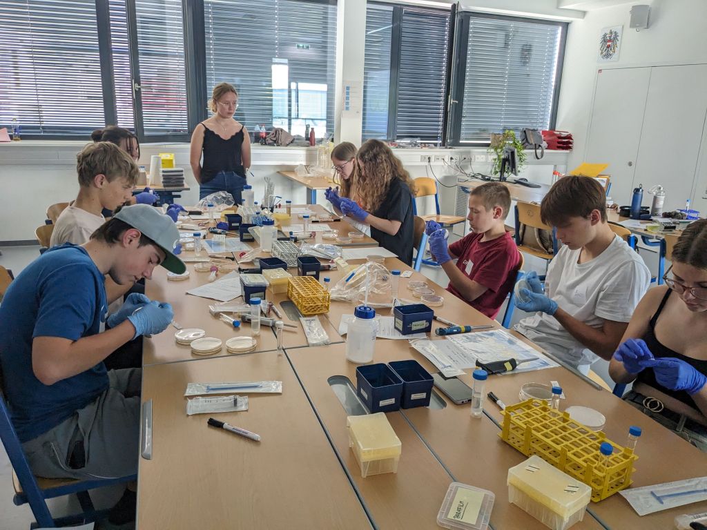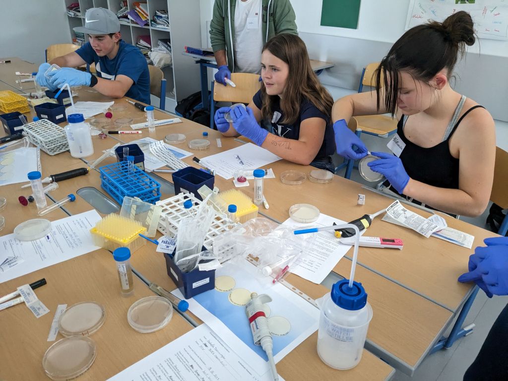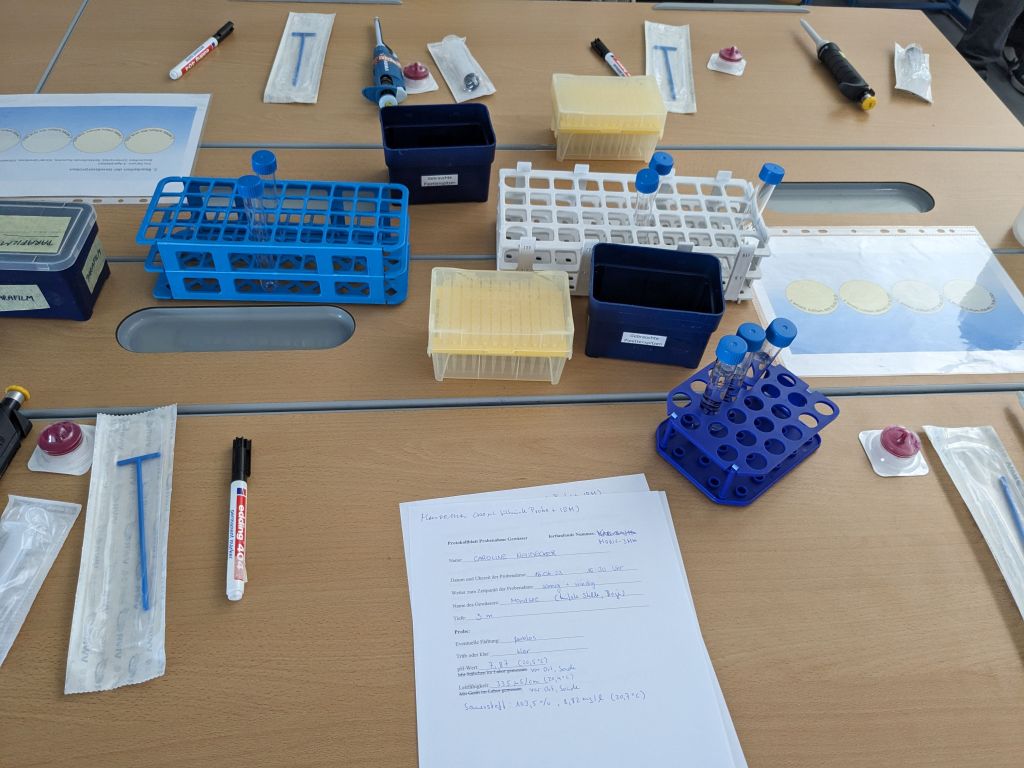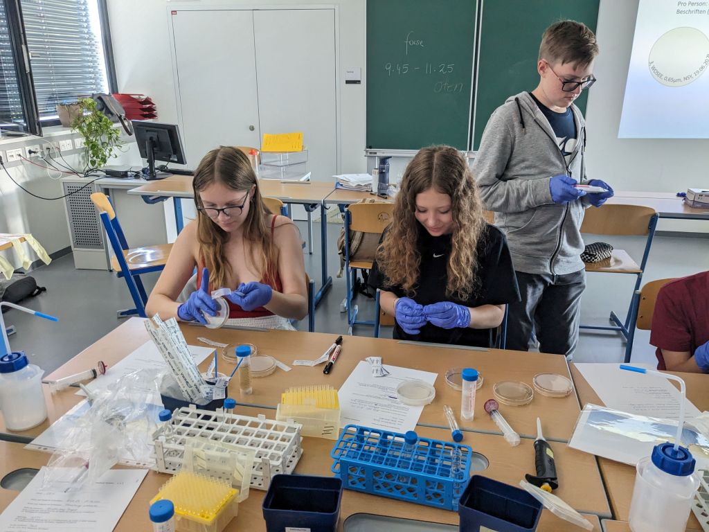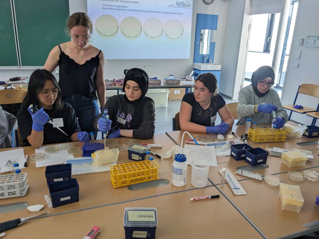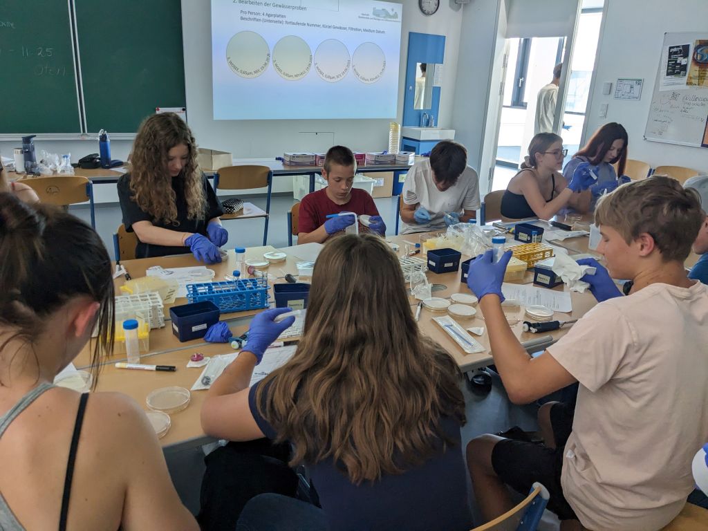 Nach einer kurzen Theorieeinheit über Bakterien und ihre Funktionen ging es für eine Gruppe an die selbst mitgebrachten Proben aus verschiedenen Gewässern. Es wurde die Leitfähigkeit gemessen und filtriert. Das filtrierte Wasser wurde auf vier verschiedene Platten aufgetragen. Dass die SchülerInnen schon mehr Übung hatten, sah man ihnen deutlich an 😉.