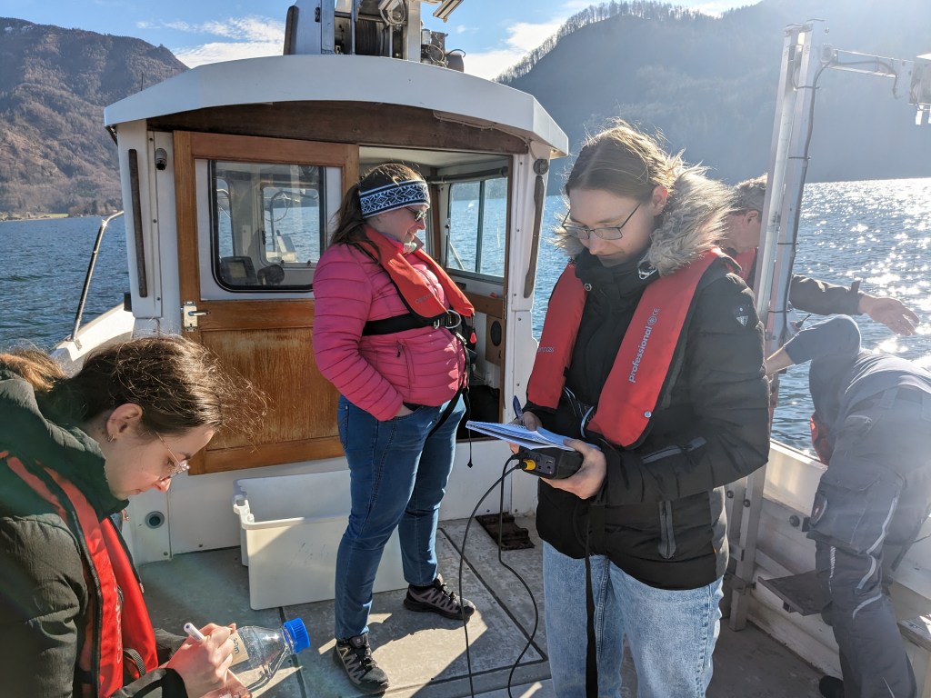 Bei herrlichem Sonnenschein starteten wir unsere Winterprobenahme am Mondsee. Begleitet wurden wir von Sabrina und Daniela, die tatkräftig mithalfen. Wir fuhren bis zur tiefsten Stelle des Sees, von der Oberfläche bis zu 60 m Tiefe betrug die Wassertemperatur dort ca. 5°C. Das bedeutet, dass der See noch keine Schichtung aufweist und wahrscheinlich noch der gesamte Wasserkörper bis zum Grund durchmischt wird. Im Labor wurden die Wasserproben auf Filter filtriert und diese eingefroren. Von diesen Filtern wird später in der zweiten Phase des Projektes direkt die DNA der Bakterien analysiert. Wir hoffen dann mehr über die Biodiversität und Vorkommen unserer Gattung Aquirufa zu erfahren.