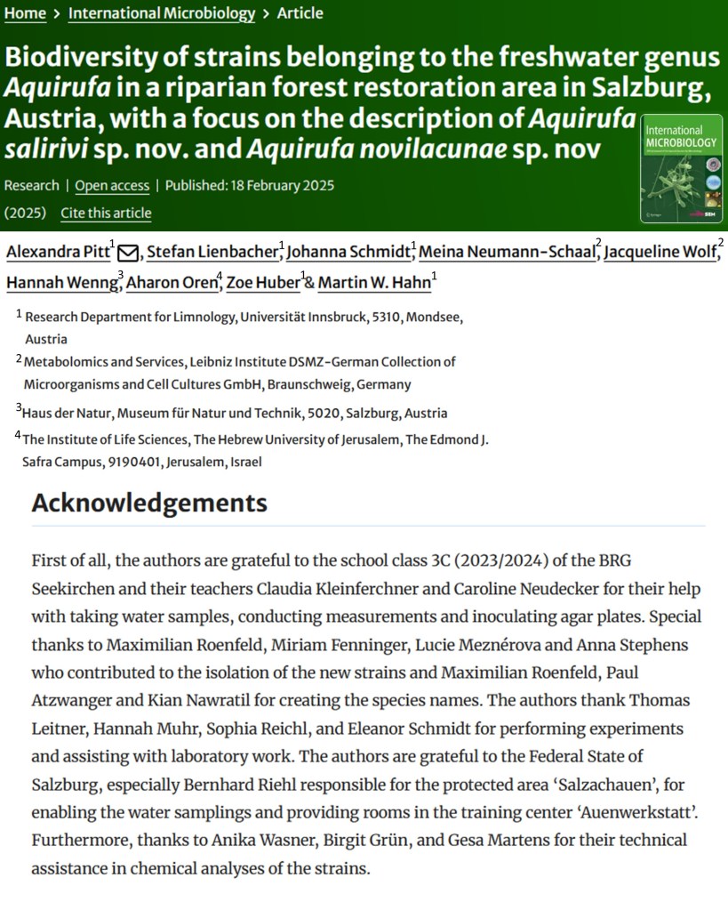 Mitgearbeitet haben eine ganze Reihe von Citizen Scientists, Schülerinnen und Schüler vom BRG Seekirchen, dem ORG Vöcklabruck und dem BORG Nonntal. Eine Schülerin hat während zwei Sommerpraktika Experimente durchgeführt, Daten ausgewertet und war an der Isolierung von einem Bakterienstamm, der eine neue Art repräsentiert, maßgeblich beteiligt. Sie ist deshalb Co-Autorin 🙂 Alle sind in der Danksagung (siehe oben) erwähnt. Hier noch ein paar Eindrücke zu den Untersuchungen und Arbeiten in der Weitwörther Au: