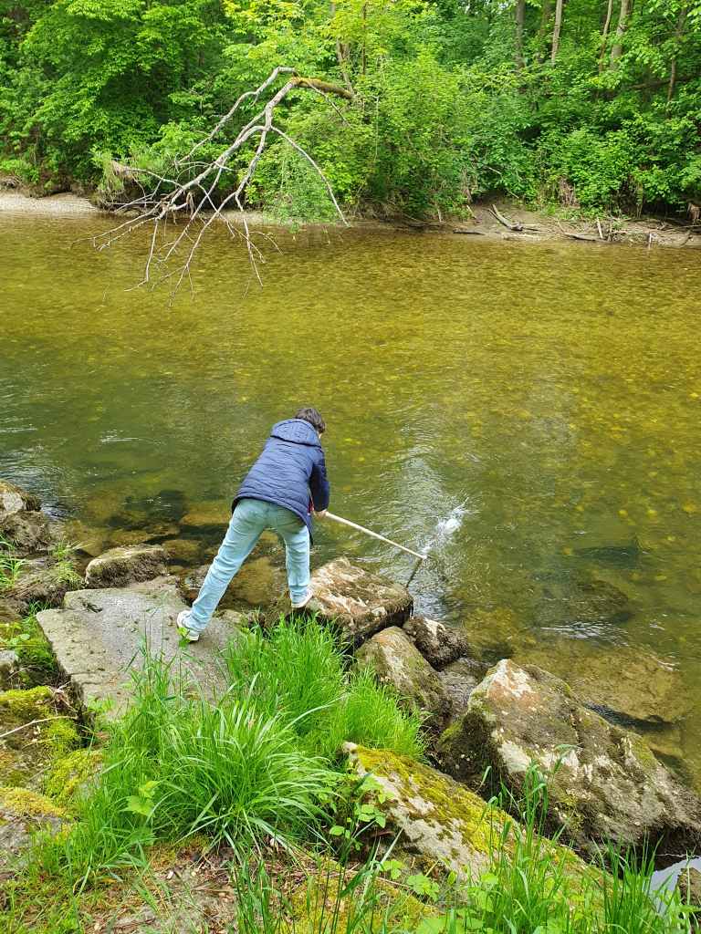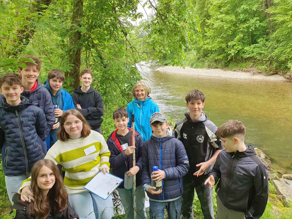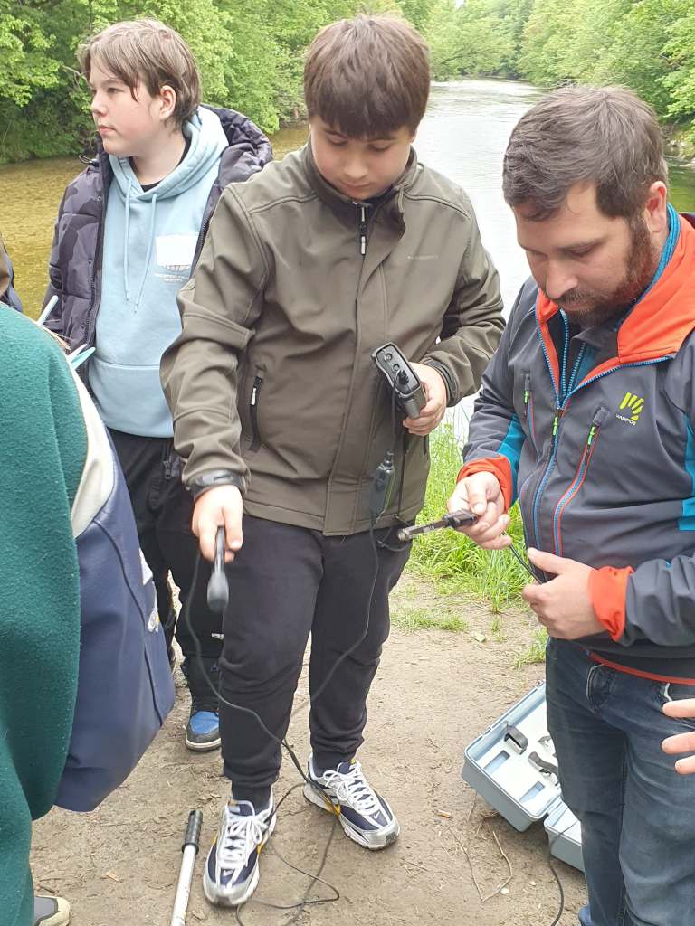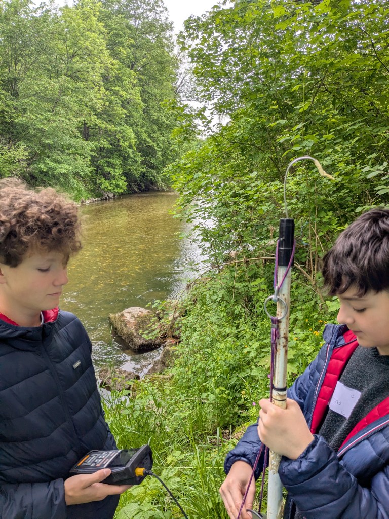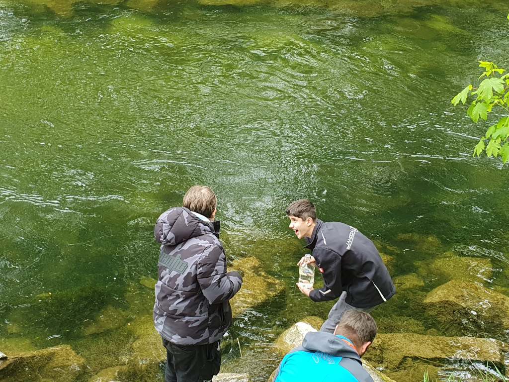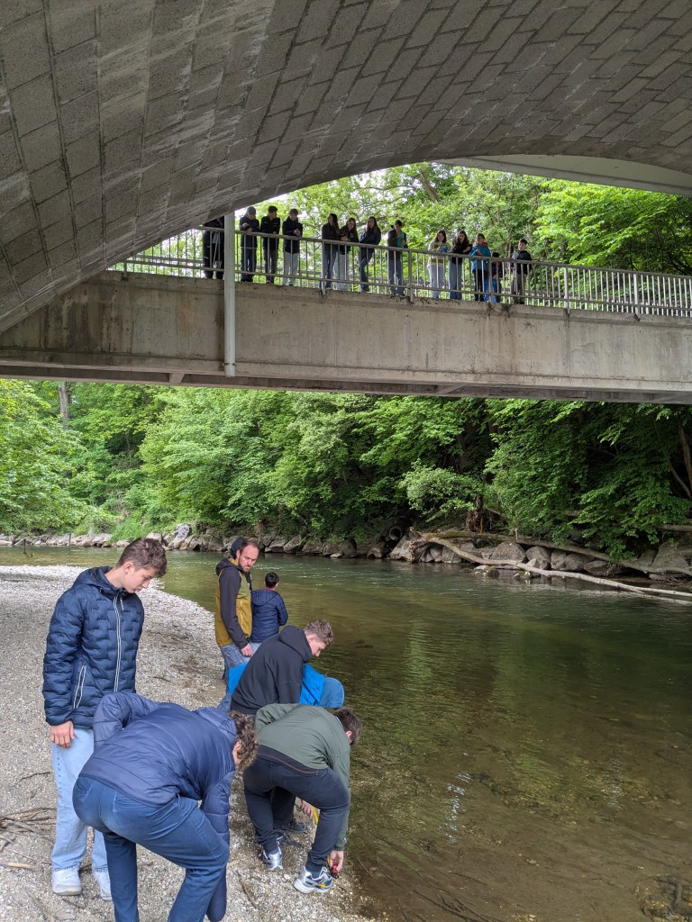 Zuerst gab es einen kleinen Vortrag von uns und wir waren sehr erstaunt, was die Schüler/innen schon alles wussten. Sogar den sogenannten Tree of Life, der alle auf der Erde lebenden Organismen darstellt, kannten die Schüler/innen. An ihm kann man die ungeheure Vielfalt der Bakterien sehr schön sehen. Er zeigt auch, dass die Lebewesen, die wir mit blosem Auge sehen können und zu denen auch der Mensch gehört, nur einen kleinen Teil der Biodiversität darstellen. Dafür war neu, dass von den vermutlich Milliarden existierenden Bakterienarten nur ca. 20.000 der Wissenschaft namentlich bekannt sind. 13 neue Arten sind bis jetzt durch unser Projekt und die Mithilfe unserer Citizen Scientists bereits dazugekommen. Nach ein paar Experimenten zu Leitfähigjkeit und pH-Wert im Klassenzimmer ging es an Ager und Vöckla um Wasserproben zu holen und Messungen vor Ort durchzuführen. Die Wasserproben haben wir später im Labor aufbereitet. Wir wollen eine Methode entwickeln, um unsere Aquirufa Bakterien und ihre verschiedenen Arten direkt aus der Erbsubstanz in der Wasserprobe nachzuweisen. Da wartet allerdings noch sehr viel Arbeit auf uns. Der absolute Höhepunkt war aber die Messung der Fließgeschwindigkeit mit Hilfe eines fluoreszierenden Farbstoffes in der Ager (mit Ton anschauen 😉 ):