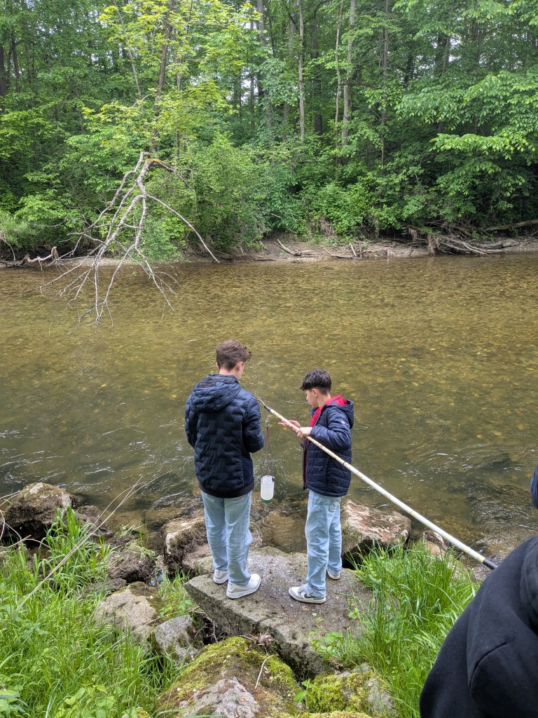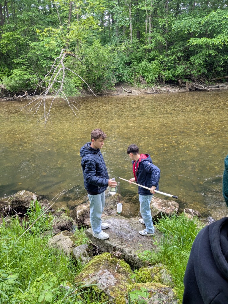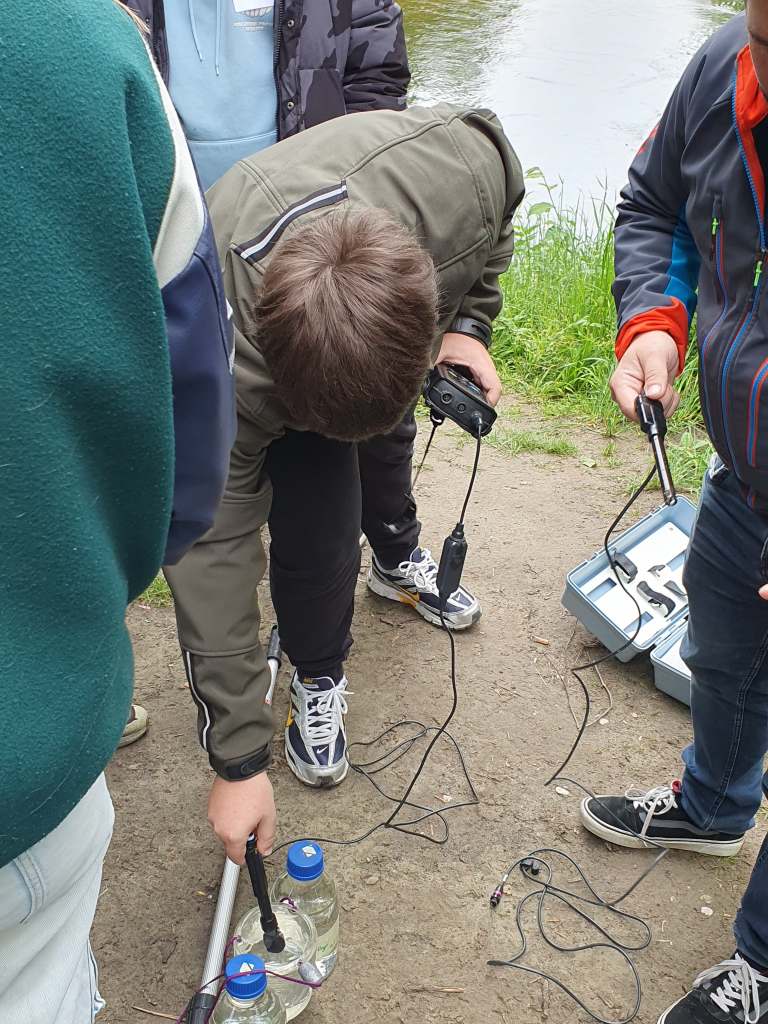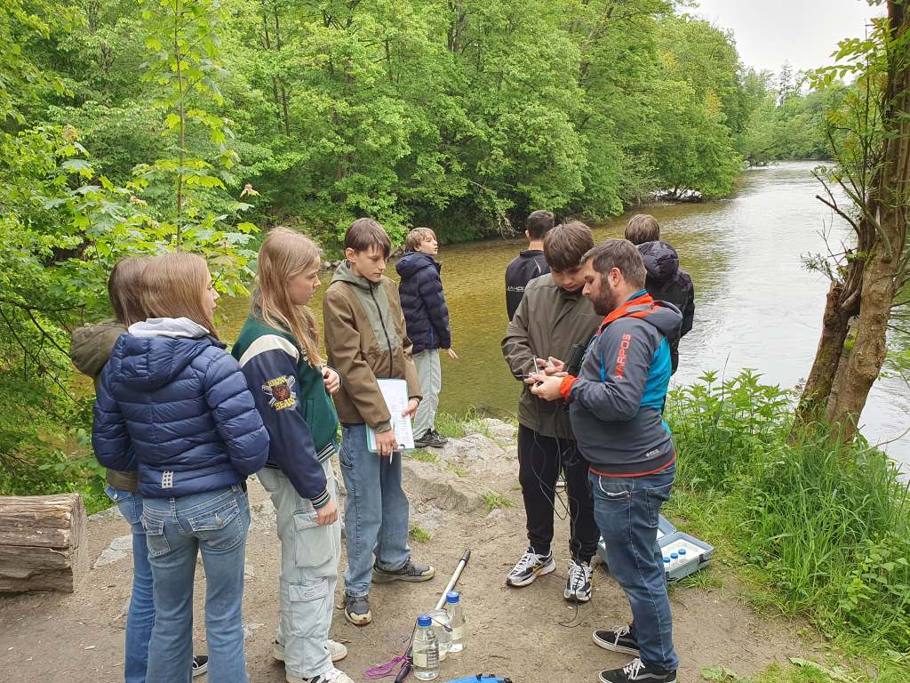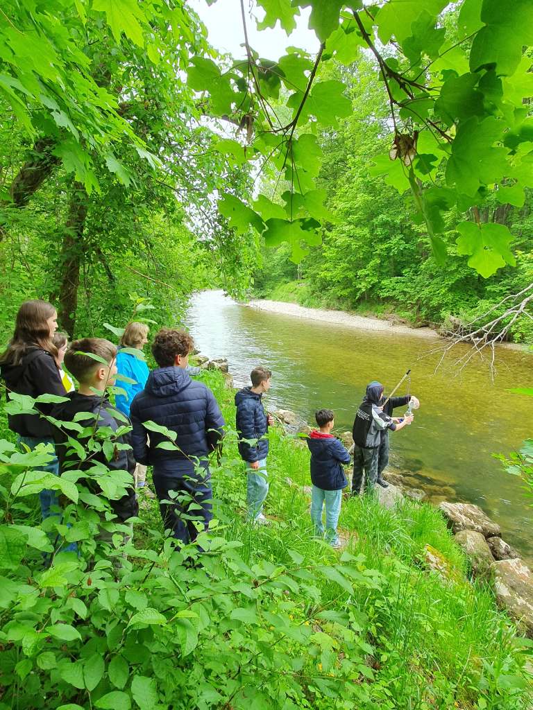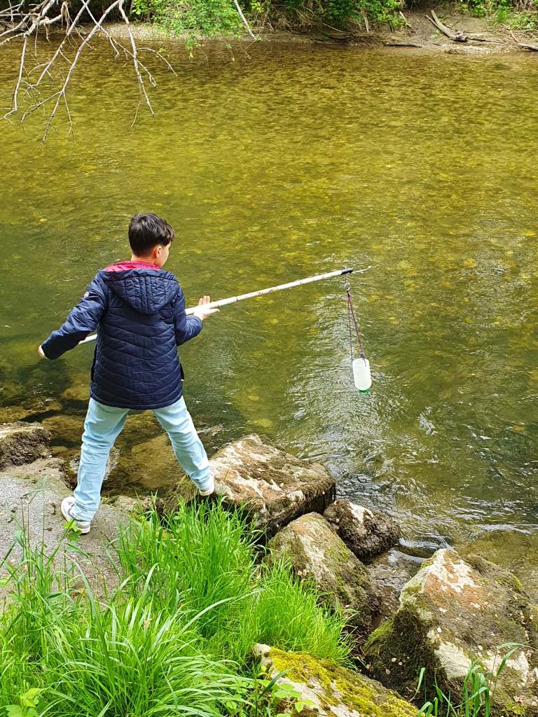 Zuerst gab es einen kleinen Vortrag von uns und wir waren sehr erstaunt, was die Schüler/innen schon alles wussten. Sogar den sogenannten Tree of Life, der alle auf der Erde lebenden Organismen darstellt, kannten die Schüler/innen. An ihm kann man die ungeheure Vielfalt der Bakterien sehr schön sehen. Er zeigt auch, dass die Lebewesen, die wir mit blosem Auge sehen können und zu denen auch der Mensch gehört, nur einen kleinen Teil der Biodiversität darstellen. Dafür war neu, dass von den vermutlich Milliarden existierenden Bakterienarten nur ca. 20.000 der Wissenschaft namentlich bekannt sind. 13 neue Arten sind bis jetzt durch unser Projekt und die Mithilfe unserer Citizen Scientists bereits dazugekommen. Nach ein paar Experimenten zu Leitfähigjkeit und pH-Wert im Klassenzimmer ging es an Ager und Vöckla um Wasserproben zu holen und Messungen vor Ort durchzuführen. Die Wasserproben haben wir später im Labor aufbereitet. Wir wollen eine Methode entwickeln, um unsere Aquirufa Bakterien und ihre verschiedenen Arten direkt aus der Erbsubstanz in der Wasserprobe nachzuweisen. Da wartet allerdings noch sehr viel Arbeit auf uns. Der absolute Höhepunkt war aber die Messung der Fließgeschwindigkeit mit Hilfe eines fluoreszierenden Farbstoffes in der Ager (mit Ton anschauen 😉 ):