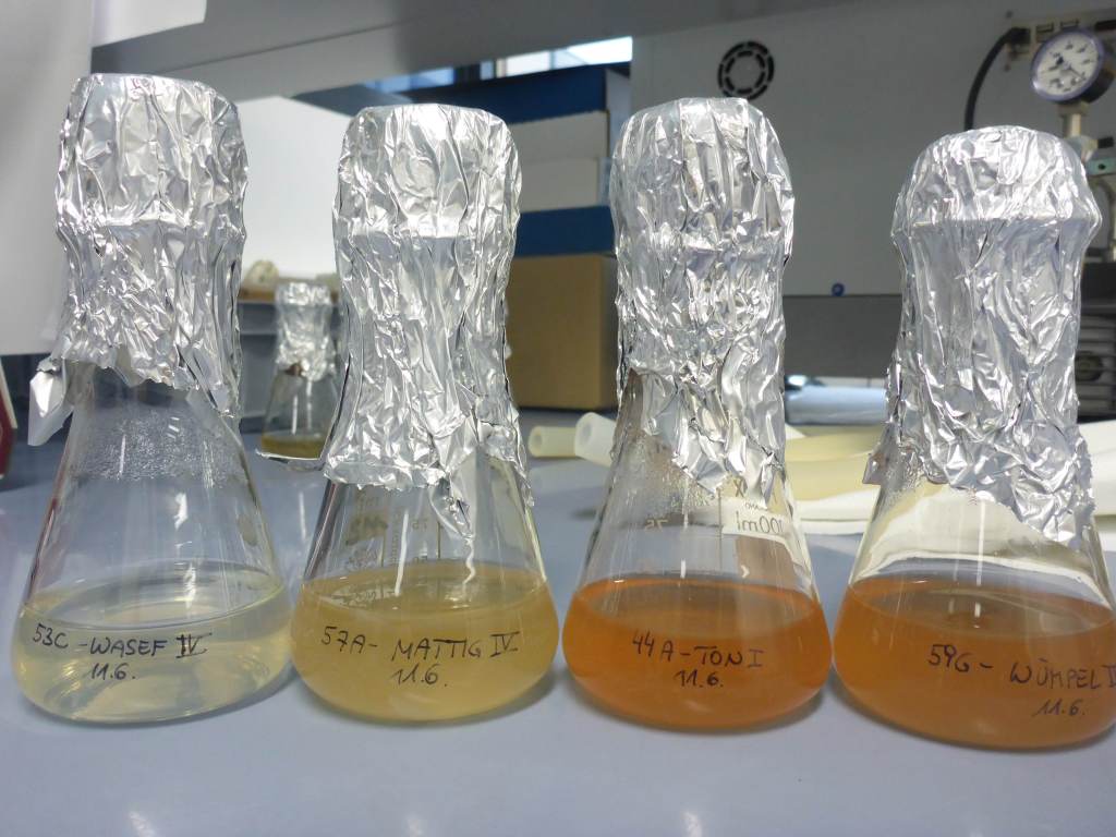 Die ausgewählten Stämme müssen nun im Labor gereinigt werden. Man sagt dazu, man stellt eine Reinkultur her. Dies bedeutet, dass die Kultur nur auf eine einzige Bakterienzelle zurückgeht. Dies erreicht man, indem man die Flüssigkultur unter der sterilen Werkbank schrittweise stark verdünnt und auf Agarplatten ausstreicht. Nun wird eine einzelne Kolonie wieder in flüssiges Medium gegeben. Diese Schritte wiederholt man dreimal. Bei gut wachsenden Bakterien, ist das in ein paar Wochen erledigt, unter Umständen kann das aber Monate dauern. Zum Schluss wird ein Gefrierschutzmittel (Glycerol) zugegeben und der Stamm kann bei -80°C eingefroren werden. Dort kann er über Jahre lagern und wächst nach dem Auftauen nach wenige Tagen wieder. Außerdem wird wie zu Beginn das 16S rRNA Gen (diesmal fast das gesamte) sequenziert. Damit kann überprüft werden, ob es sich immer noch um den gleichen Stamm, wie zu Beginn der Aufreinigung handelt.
