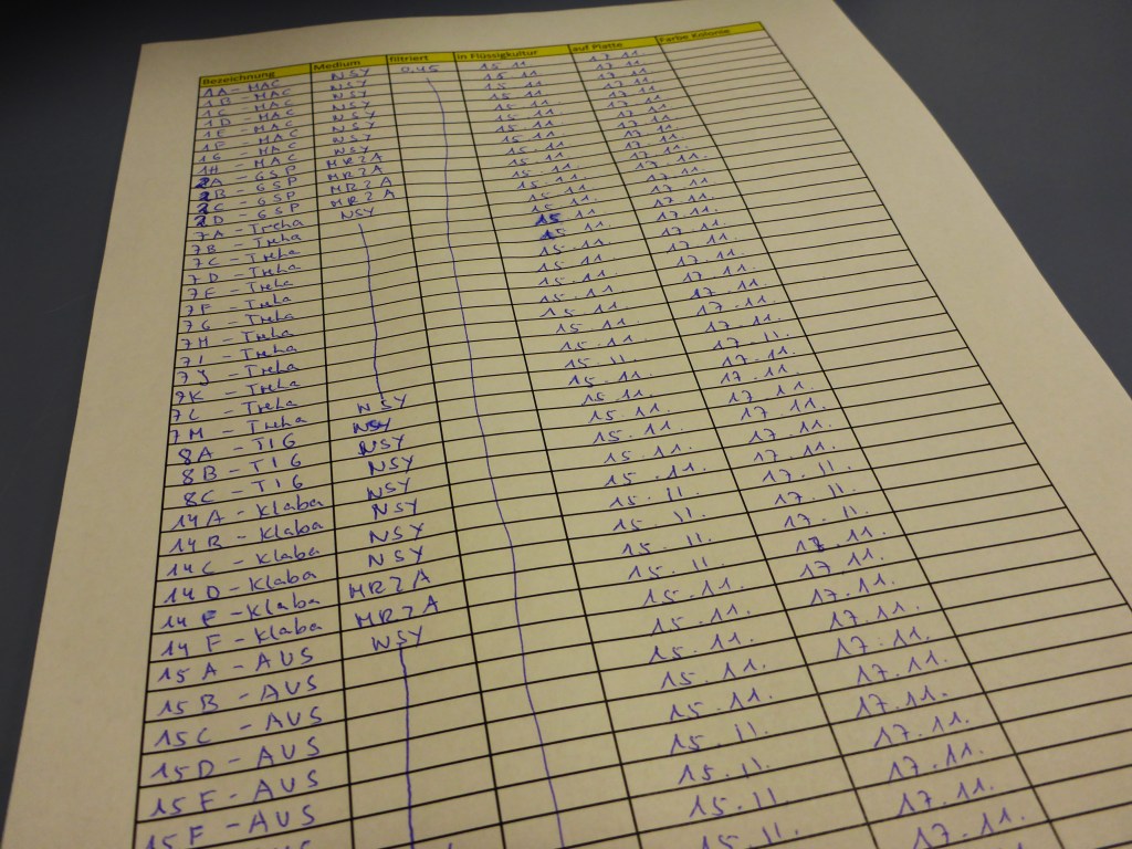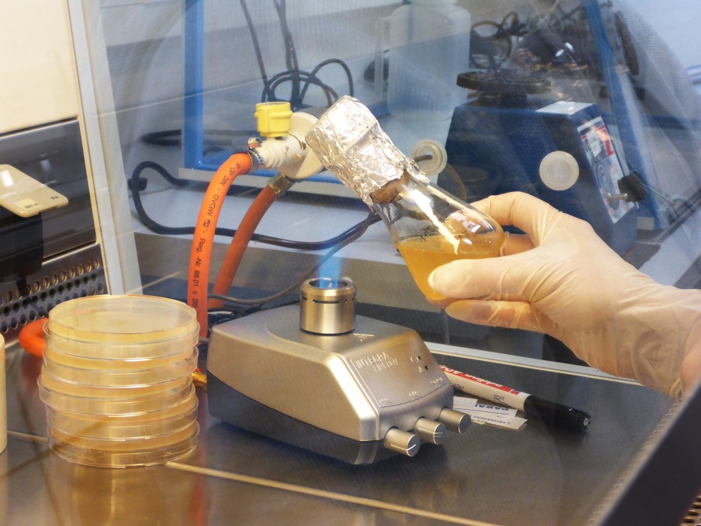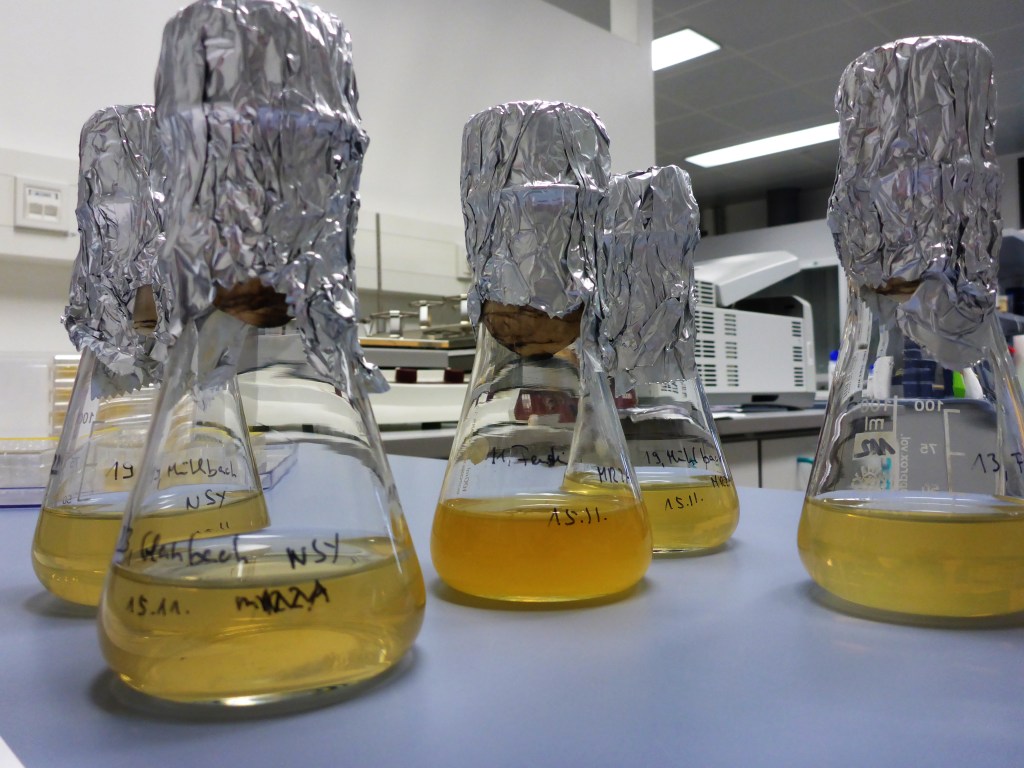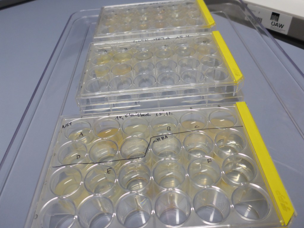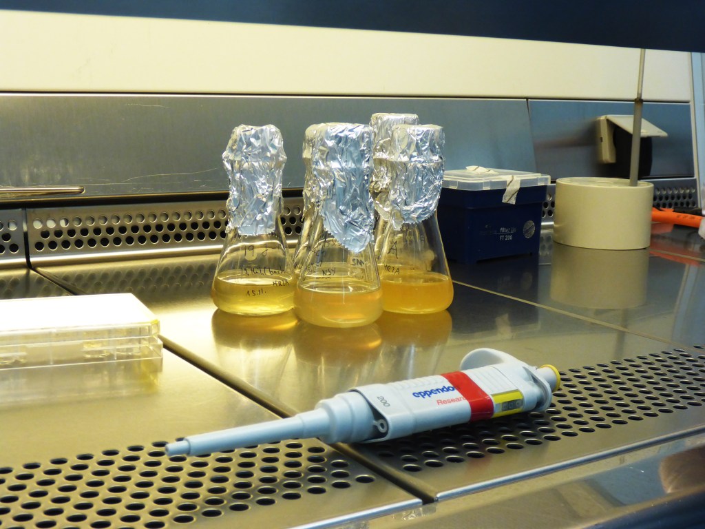 Unter der sterilen Werkbank wurden einzelne Kolonien mit etwas Agar vorsichtig von der Platte gehoben und in flüssiges Medium gegeben. Als Kulturgefäße dienten Platten mit 24 Vertiefungen und Glaskölbchen (siehe Foto).