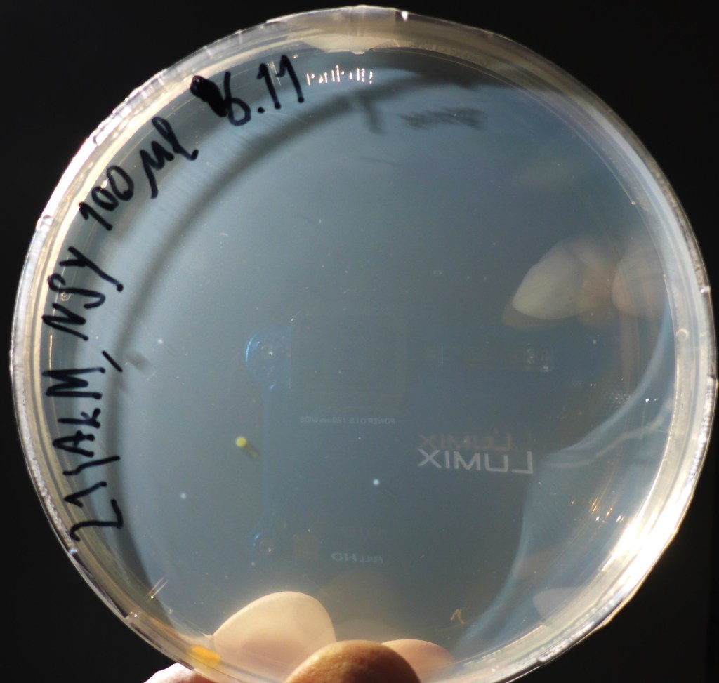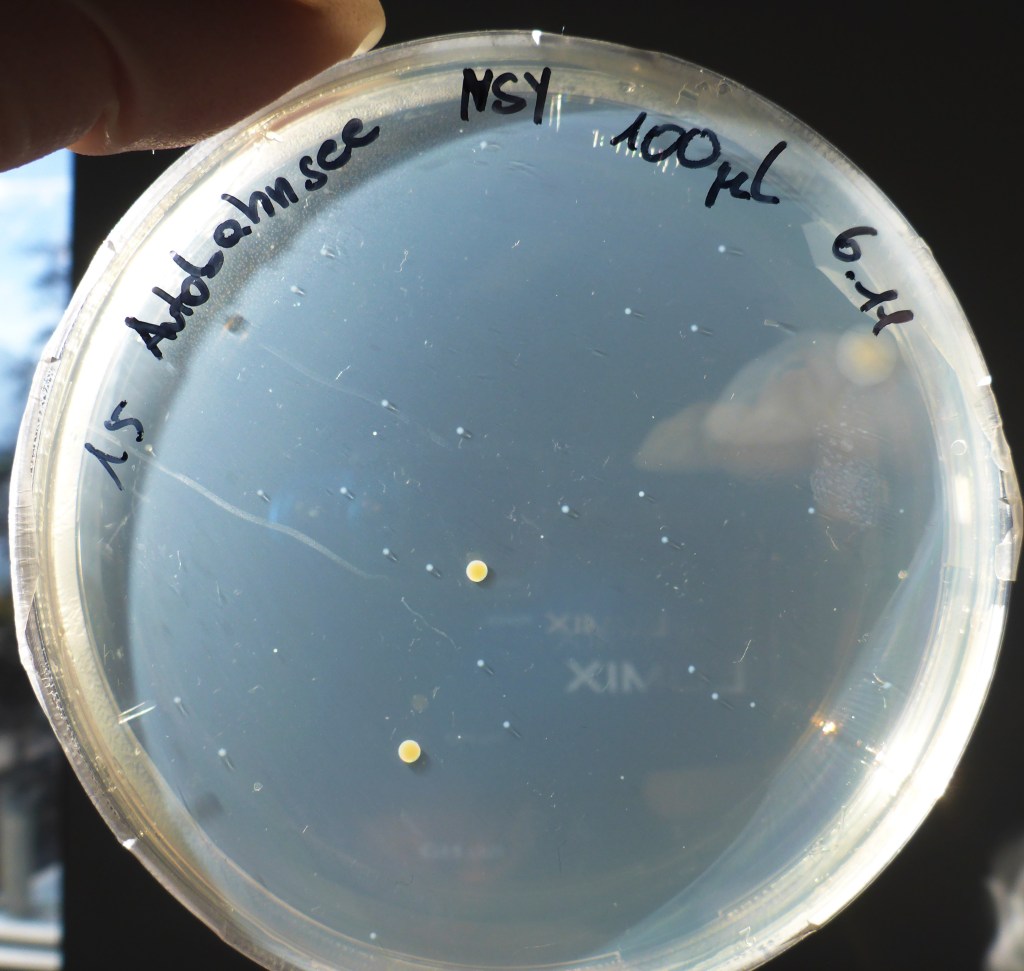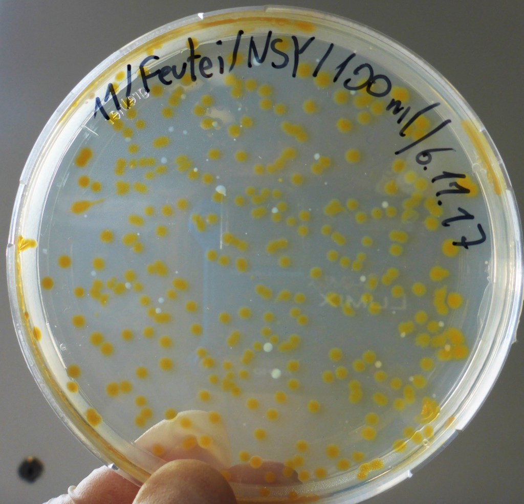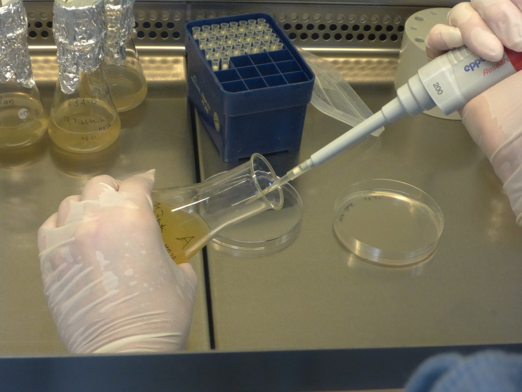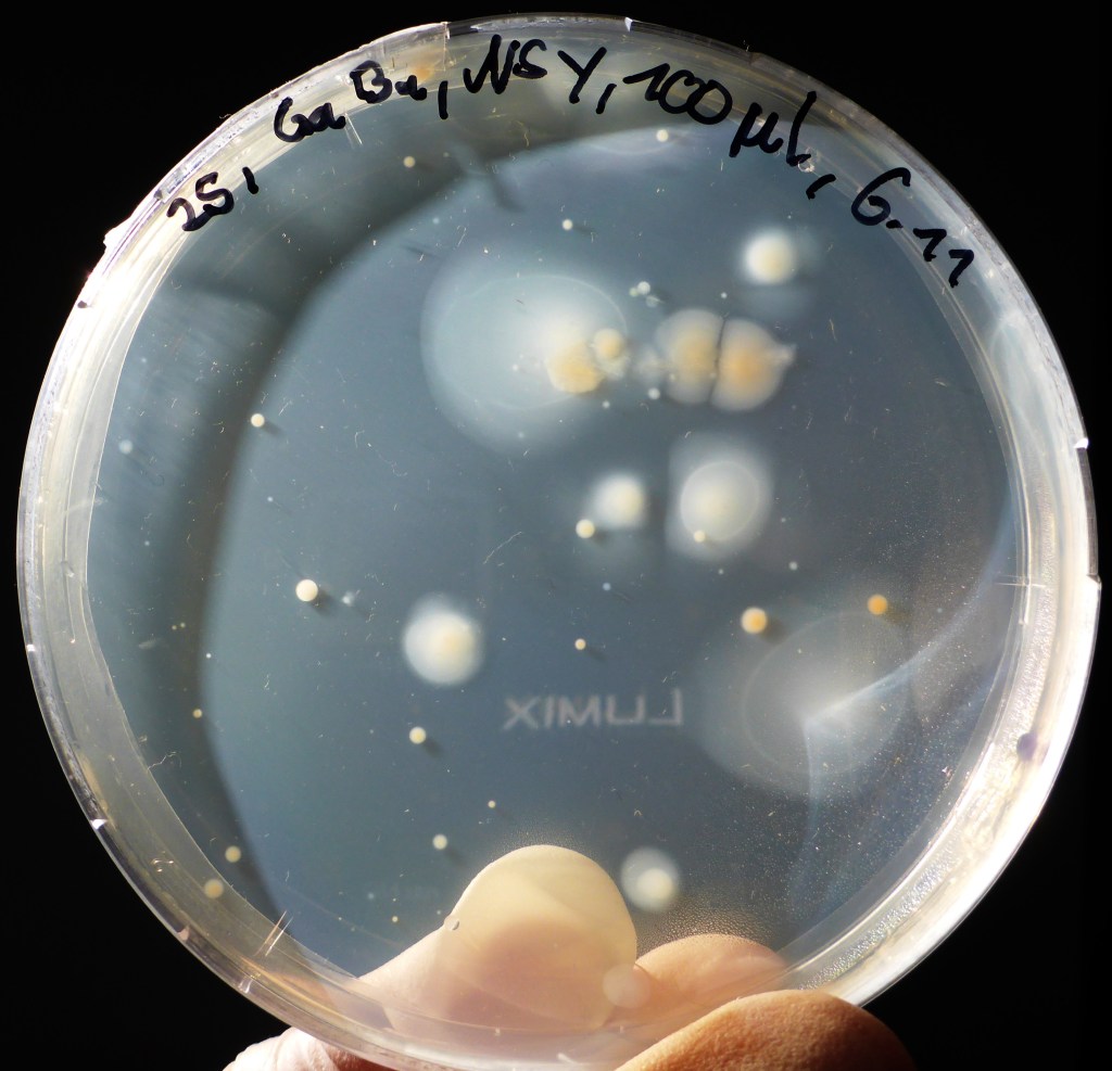 Nach einigen Tagen wurden von den Flüssigkulturen die ausgewählt, in denen Bakterien gewachsen waren. Erkennen kann man dies daran, dass das Medium nicht mehr klar wie am Anfang, sondern trüb ist. Es wurden jeweils 50 µl auf eine Agarplatte pipettiert und mit einer Impföse verteilt. Auf diese Weise wurden über 100 Platten mit Bakterienstämmen angelegt.