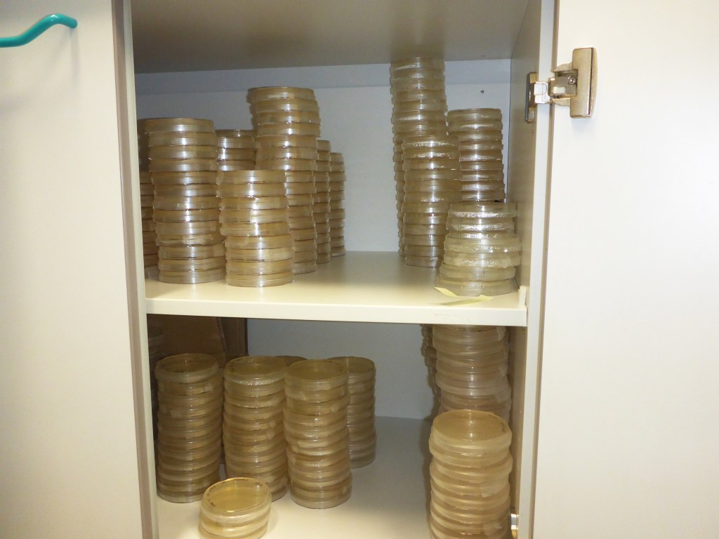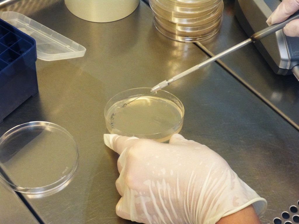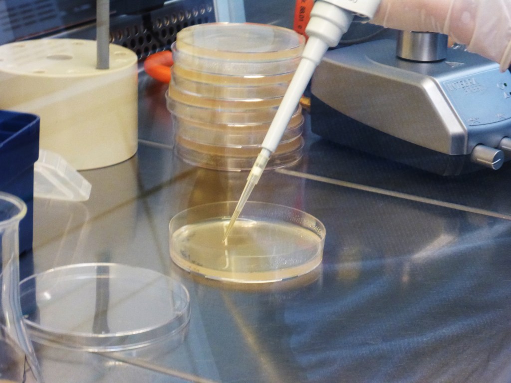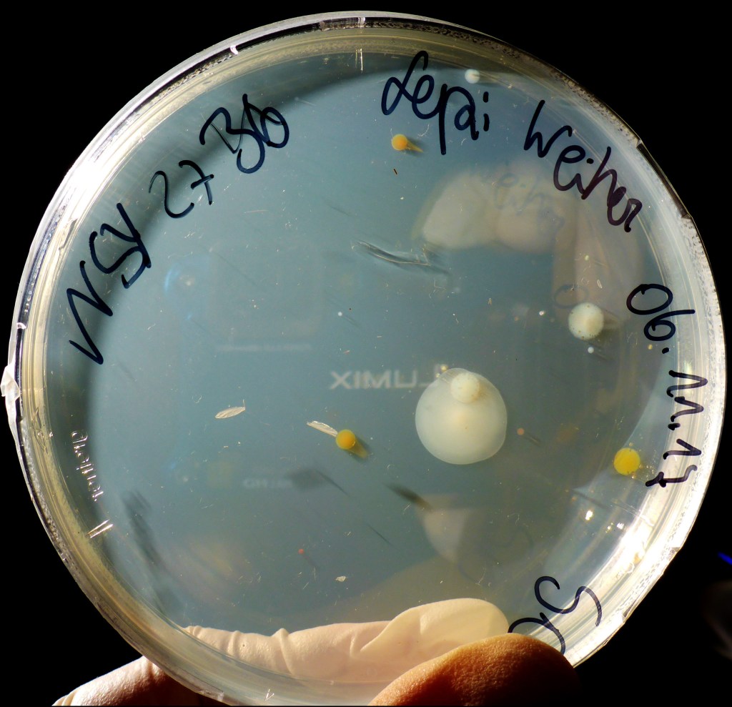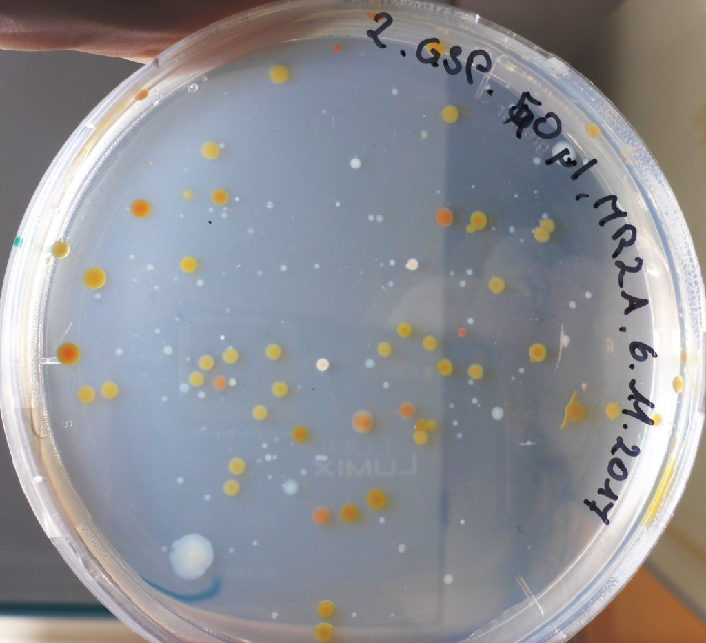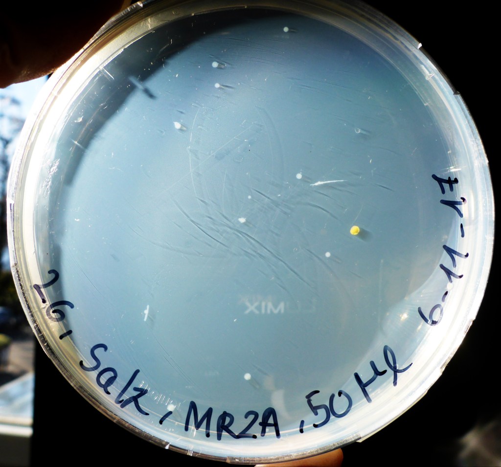 Nach einigen Tagen wurden von den Flüssigkulturen die ausgewählt, in denen Bakterien gewachsen waren. Erkennen kann man dies daran, dass das Medium nicht mehr klar wie am Anfang, sondern trüb ist. Es wurden jeweils 50 µl auf eine Agarplatte pipettiert und mit einer Impföse verteilt. Auf diese Weise wurden über 100 Platten mit Bakterienstämmen angelegt.