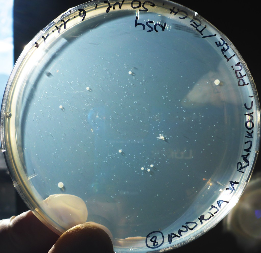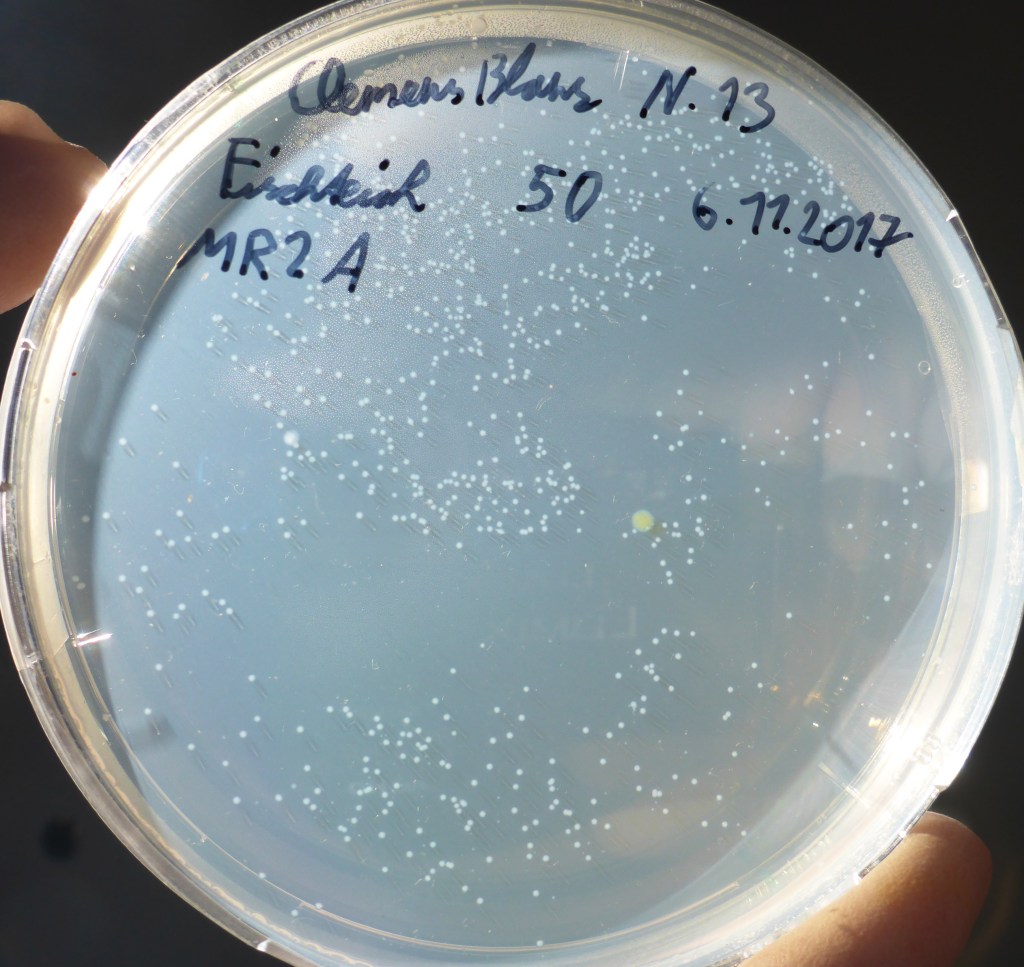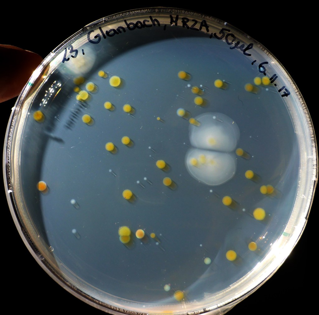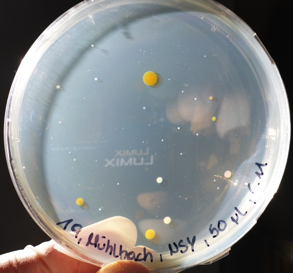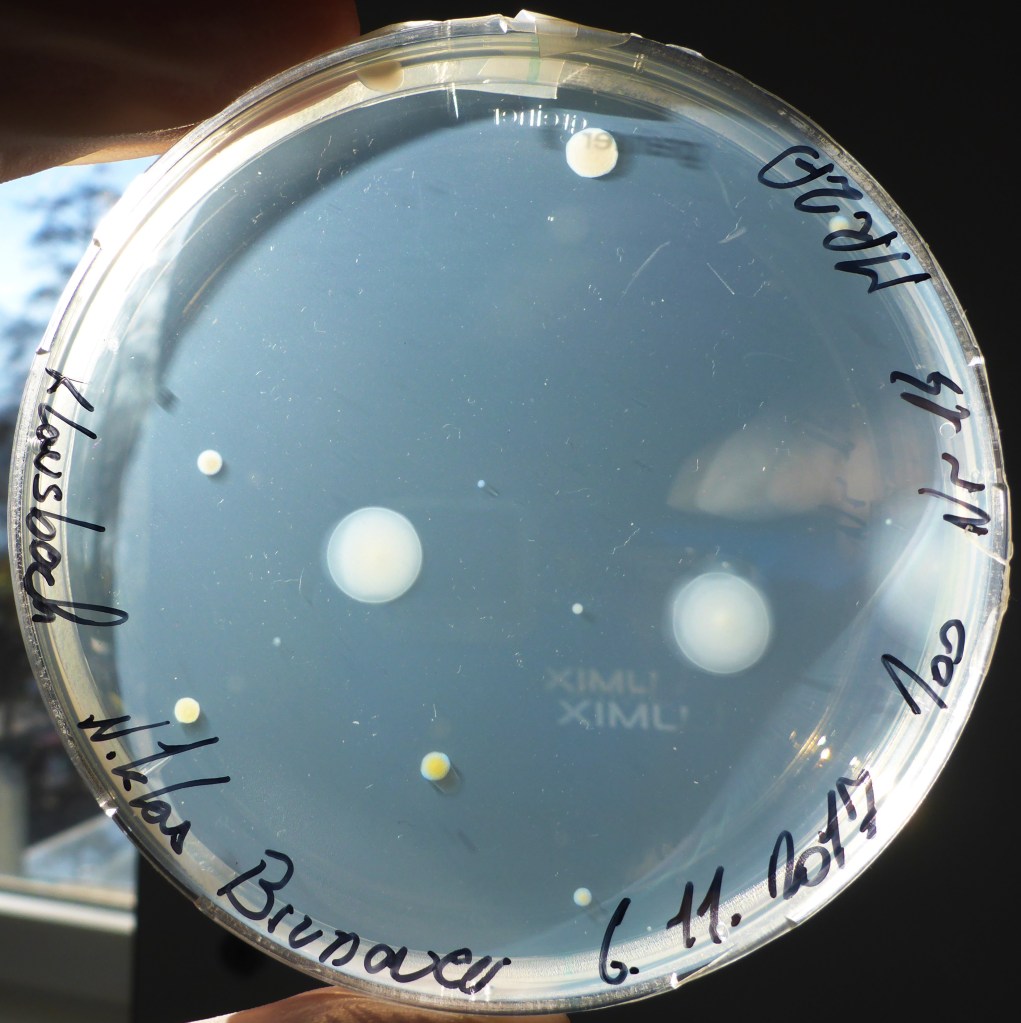 Die im BORG Nonntal von den Schüler/innen der Klasse 6c mit Gewässerproben beimpften Agarplatten wurden 10 Tage bei Raumtemperatur inkubiert. Dann waren schon viele Bakterienkolonien gewachsen: