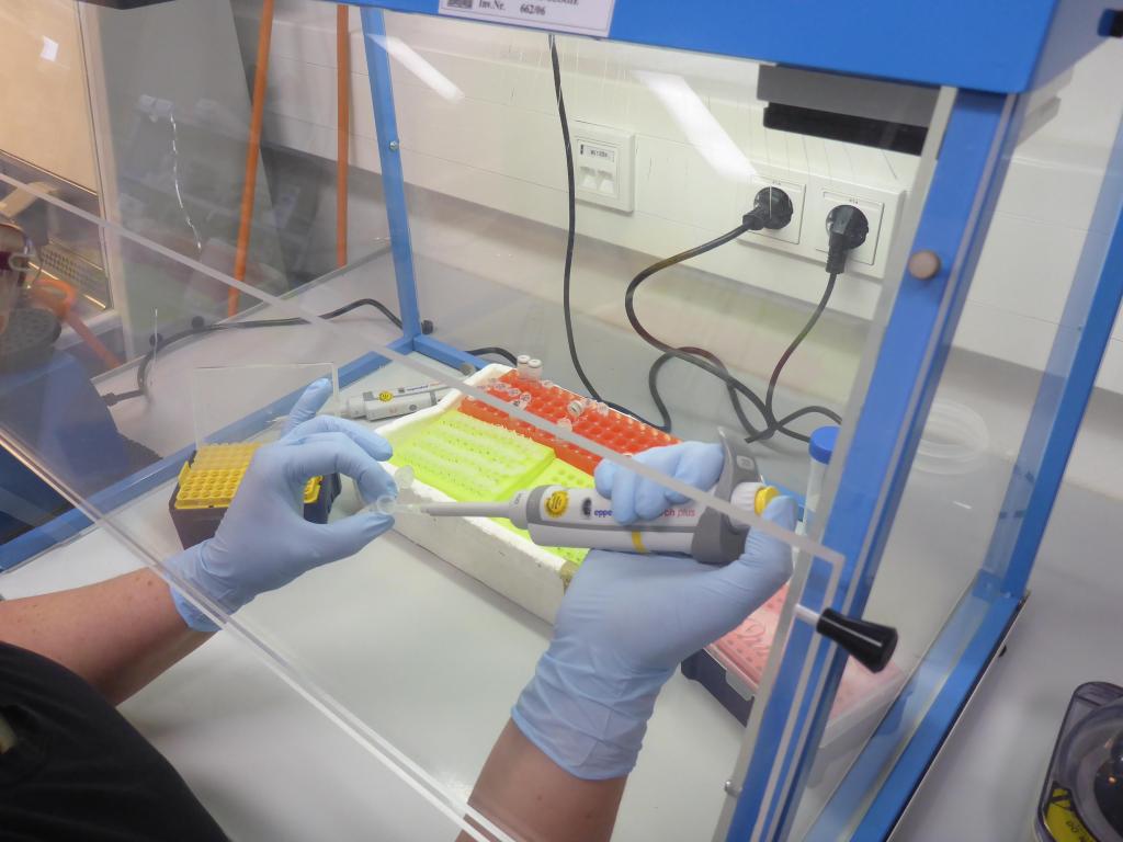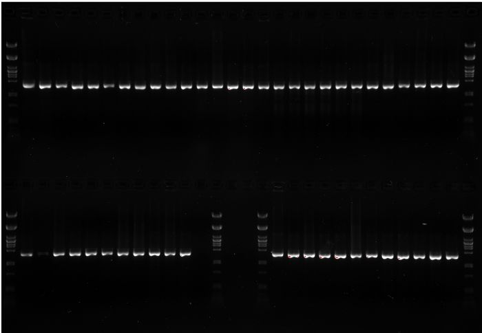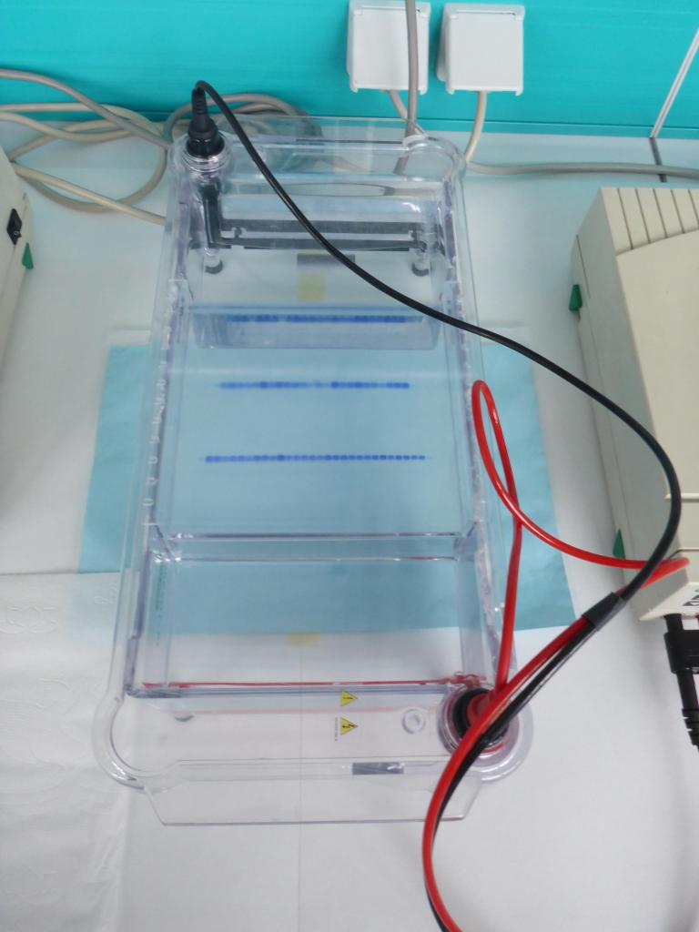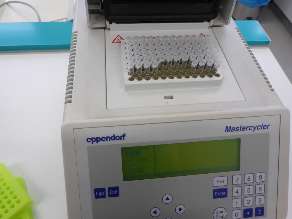 Damit nun die Erbsubstanz (DNA) untersucht werden kann, muss sie erst einmal vervielfältigt werden. Dieses Verfahren nennt man PCR (Polymerasekettenreaktion). Für die Entwicklung dieser genialen Methode erhielt Karry Mullis 1993 den Nobelpreis für Chemie. Dies geschieht in einem sogenannten Thermocycler. Der macht eigentlich nichts anderes als in vielen Cyclen eine ganz genaue Temperatur zu halten. Zur Kontrolle wurden die Proben dann auf ein Gel aufgetragen und dieses fotographiert. Alle Proben waren in Ordnung, die PCR hatte funktioniert.