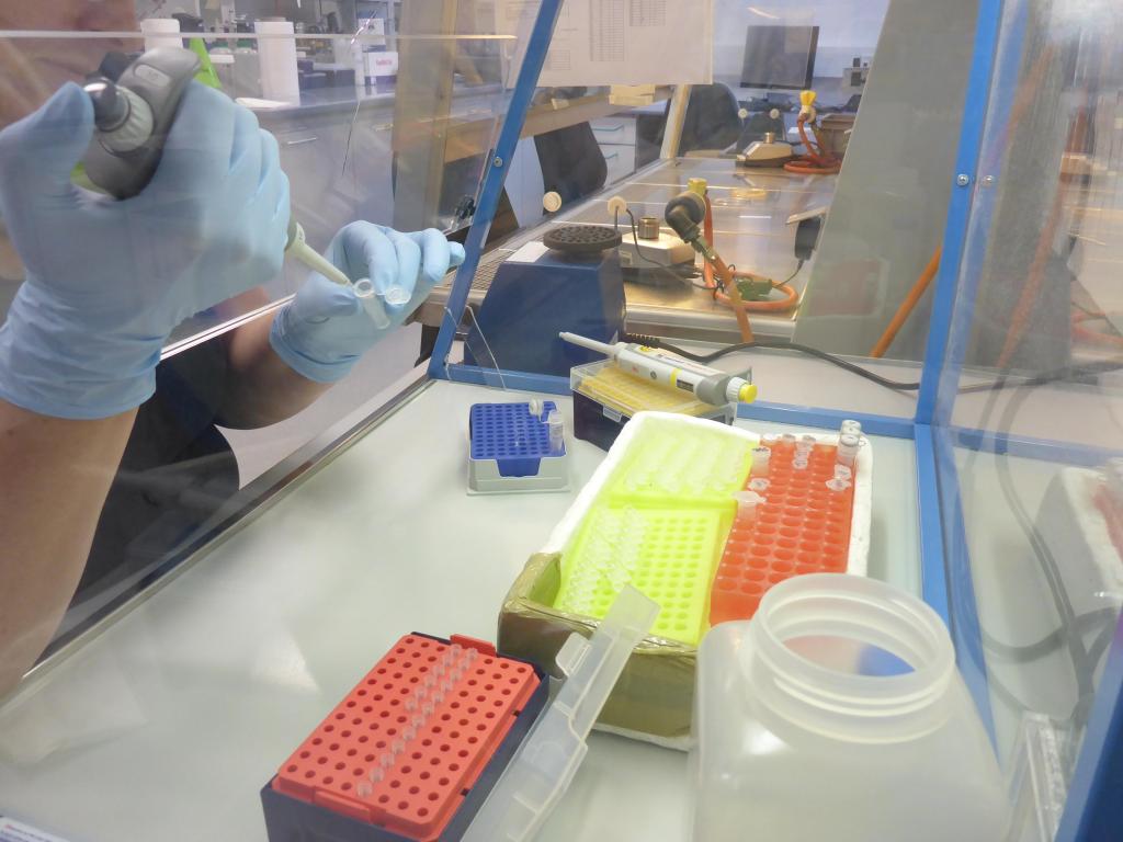Die DNA-Proben wurden verpackt, zur Post gebracht und nach München verschickt. Dort wurden sie bei der Firma Eurofins sequenziert. Das bedeutet, dass zunächst mal ein winziger Teil der DNA, das sogenannte 16S rRNA Gen, ausgelesen wurde. Das kann man sich so vorstellen, dass die Erbsubstanz ein riesiges Buch ist und eine Zeile des Buches wurde entziffert. Aber anders als in einem Buch besteht der Text nur aus 4 Buchstaben nämlich A,T,C und G, wobei diese Buchstaben für bestimmte chemische Verbindungen stehen.