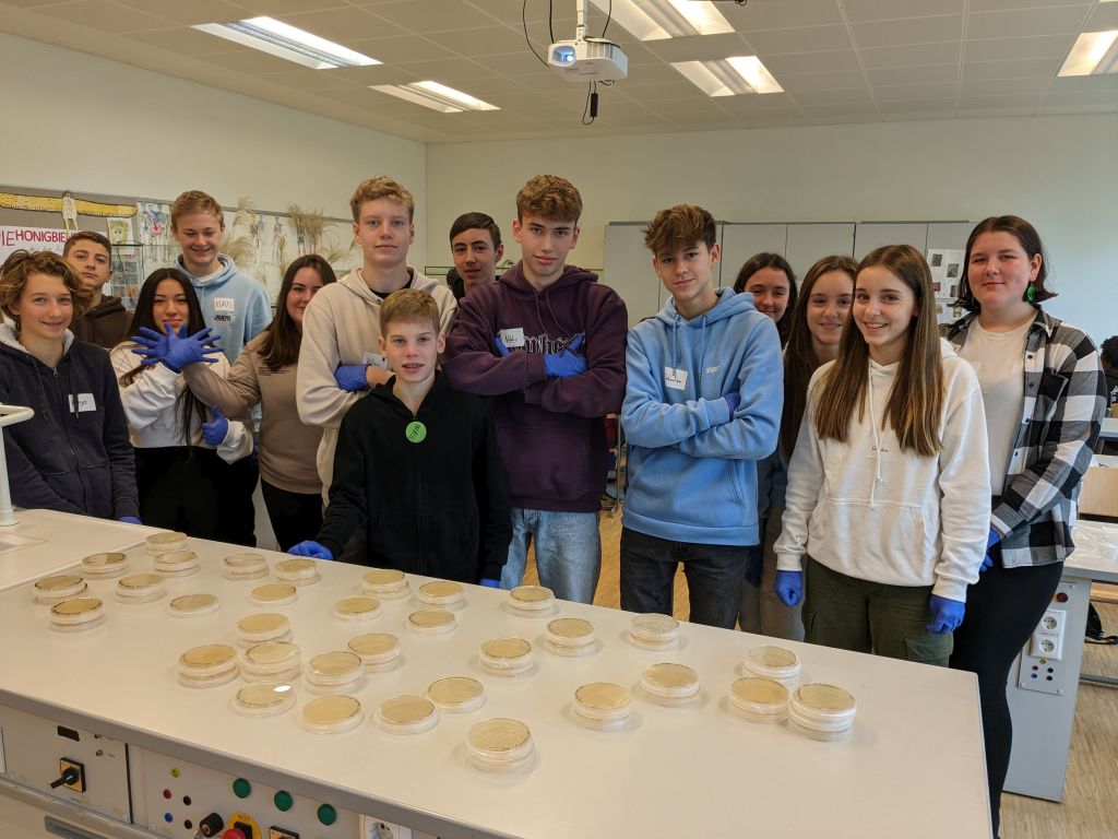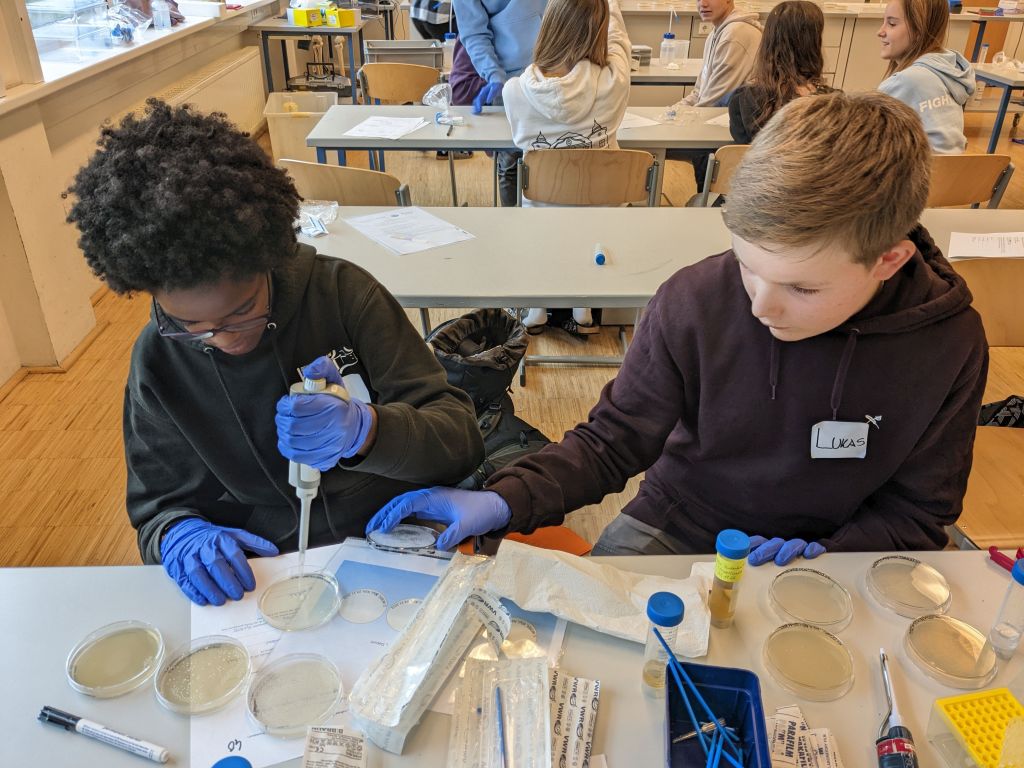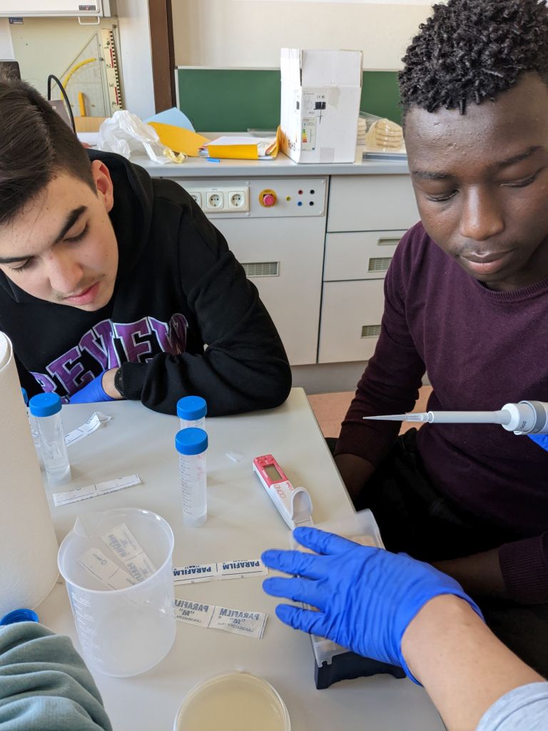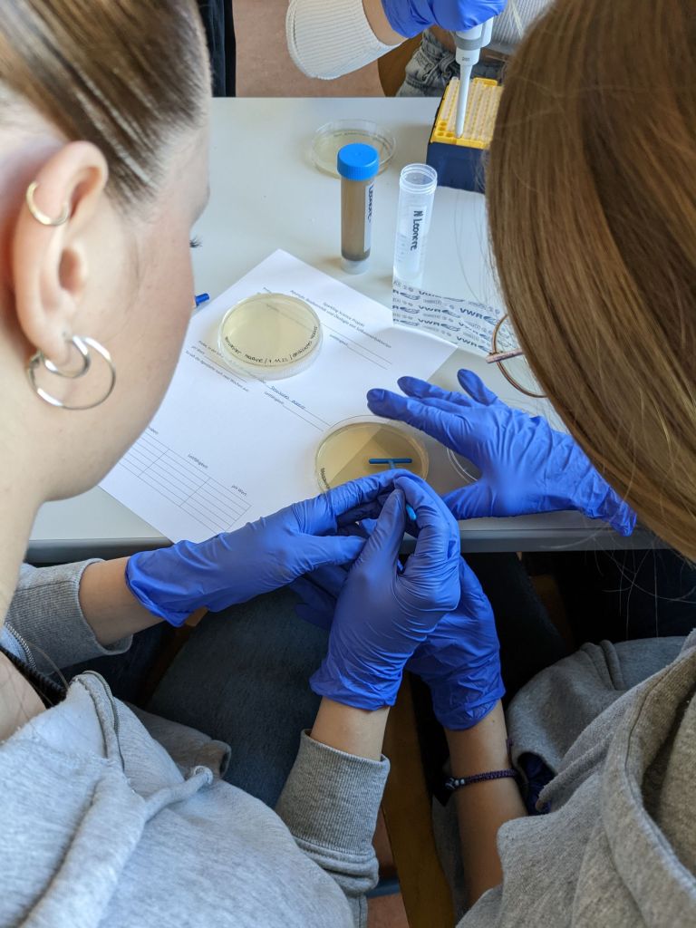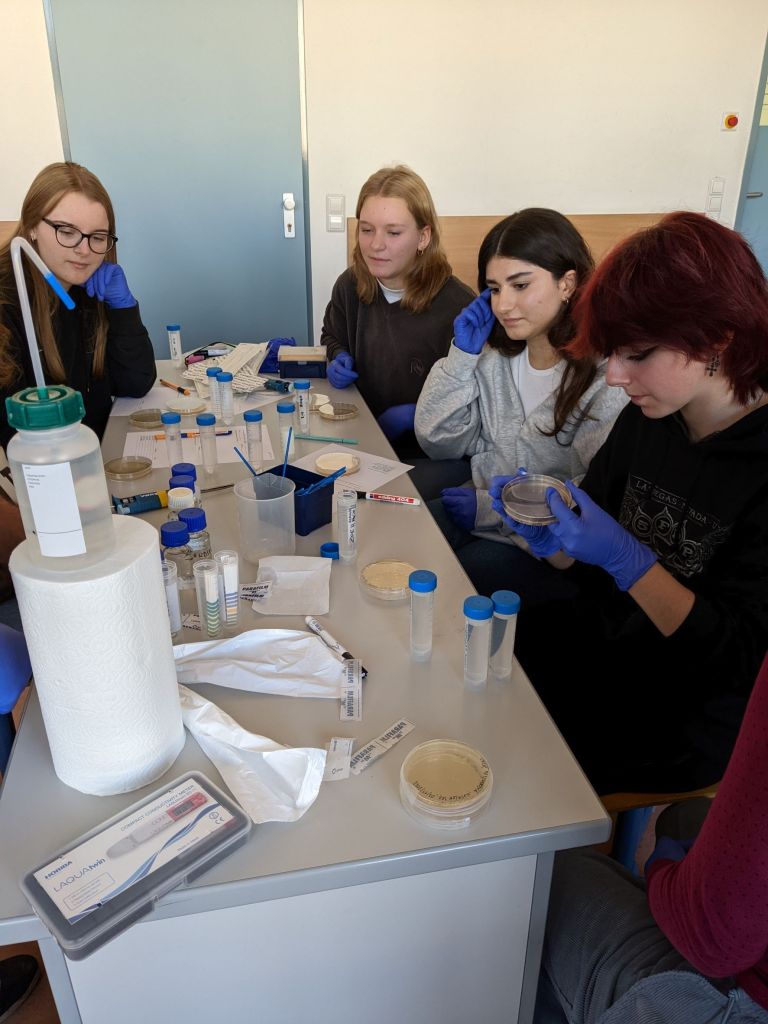 First we gave an introduction to the topic of bacteria, what they are and their importance for the environment and for us. The students knew already a lot and contributed their knowledge. Afterwards they worked in two groups, one looked at the agar plates from the first workshop and the others handled the water samples, which they had brought. On the agar plates with drinking water they spot some bacterial colonies. That’s o.k., drinking water contains bacteria, considering the 1,5 kg microorganisms in each human body, it is not so astonishing. On the agar plates with disinfectants and Vodka 😉 no colonies could be detected. We had led also agar plates open in the classroom, on them nicly colored colonies from air bacteria and mold cultures could be seen. Working with the individual water samples was due to the practice of the first workshop quiet easy. We are very curious what will grow on these plates from the students.