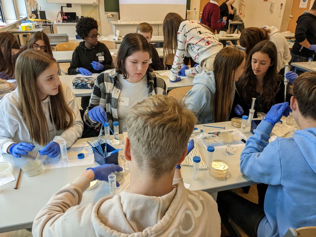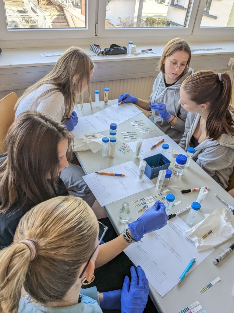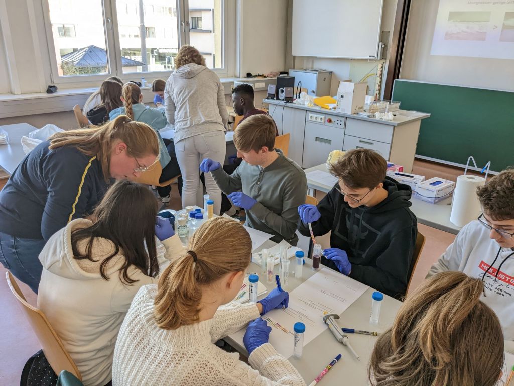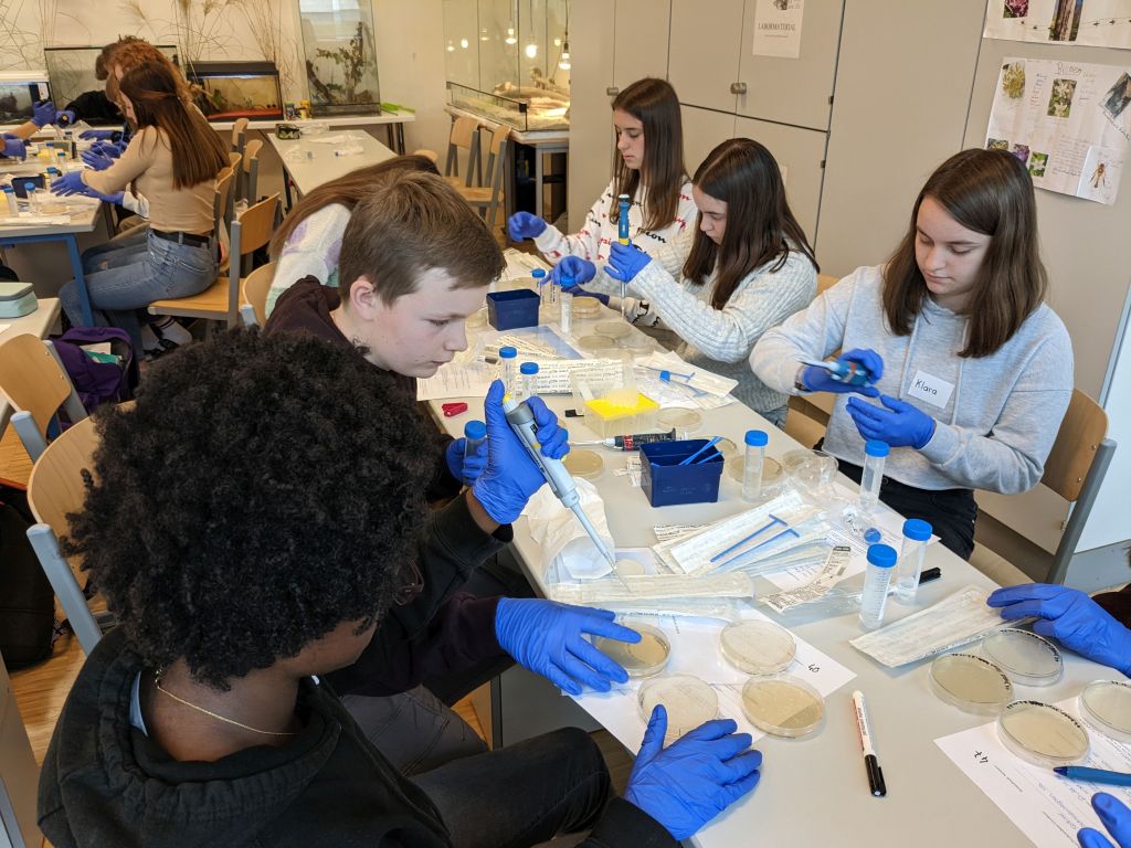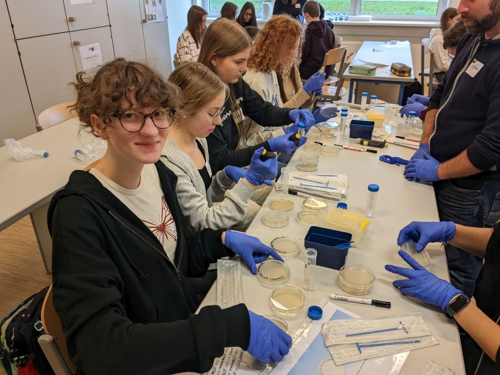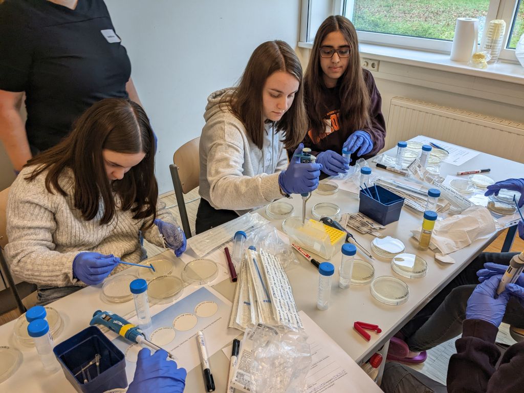First we gave an introduction to the topic of bacteria, what they are and their importance for the environment and for us. The students knew already a lot and contributed their knowledge. Afterwards they worked in two groups, one looked at the agar plates from the first workshop and the others handled the water samples, which they had brought. On the agar plates with drinking water they spot some bacterial colonies. That’s o.k., drinking water contains bacteria, considering the 1,5 kg microorganisms in each human body, it is not so astonishing. On the agar plates with disinfectants and Vodka 😉 no colonies could be detected. We had led also agar plates open in the classroom, on them nicly colored colonies from air bacteria and mold cultures could be seen. Working with the individual water samples was due to the practice of the first workshop quiet easy. We are very curious what will grow on these plates from the students.