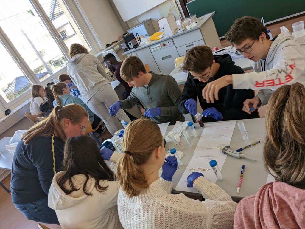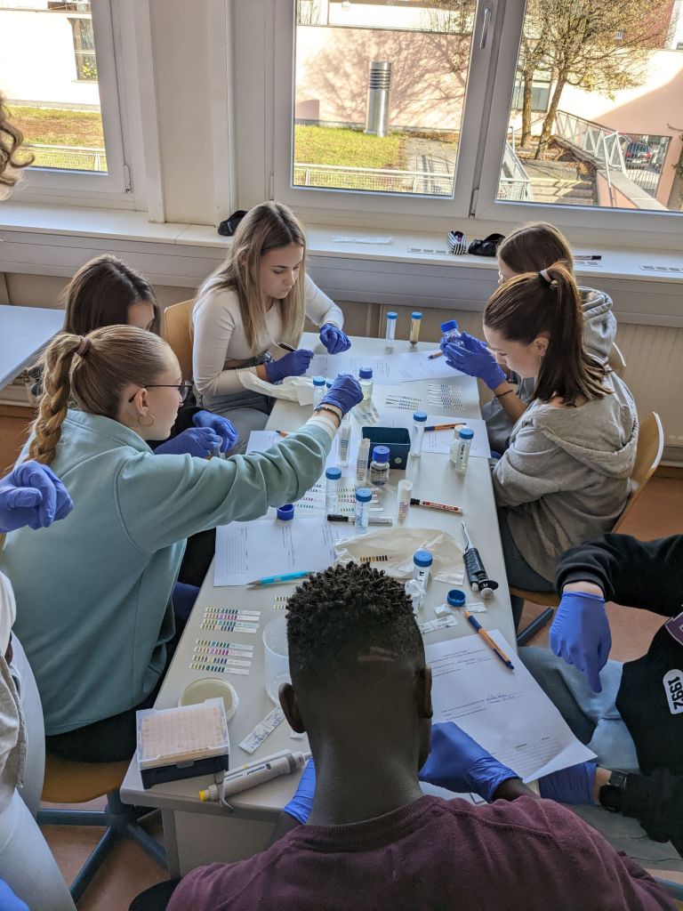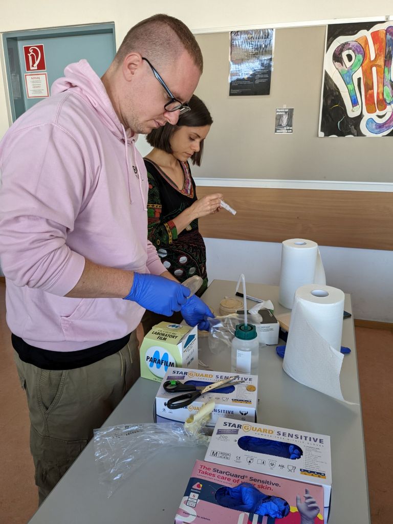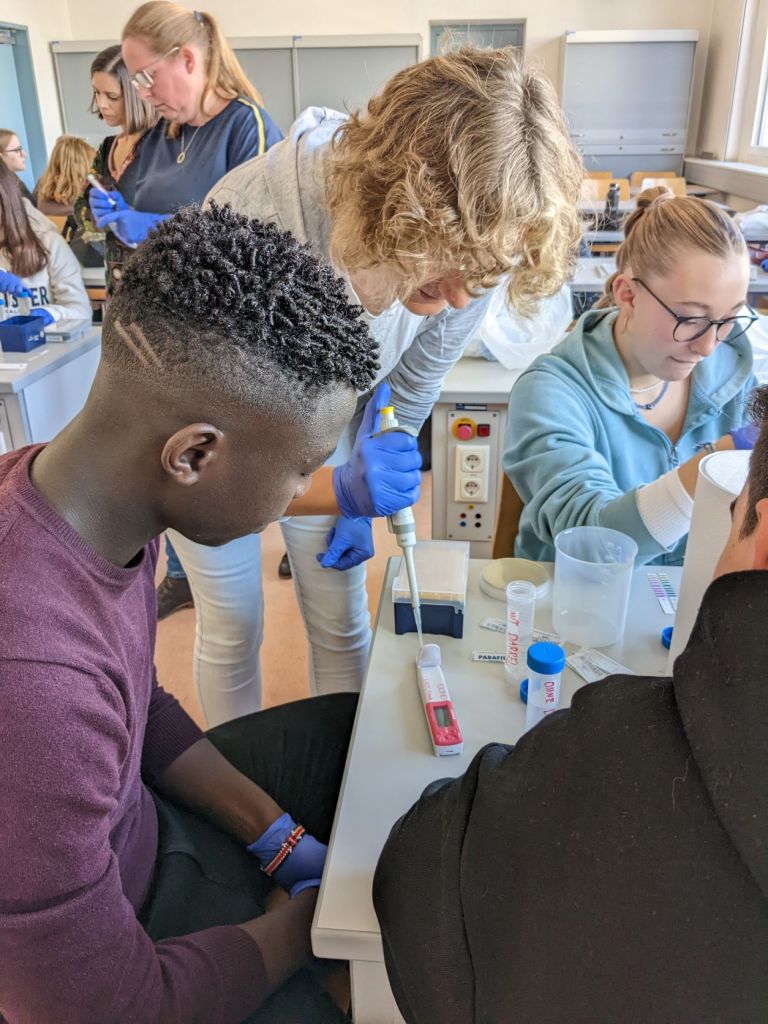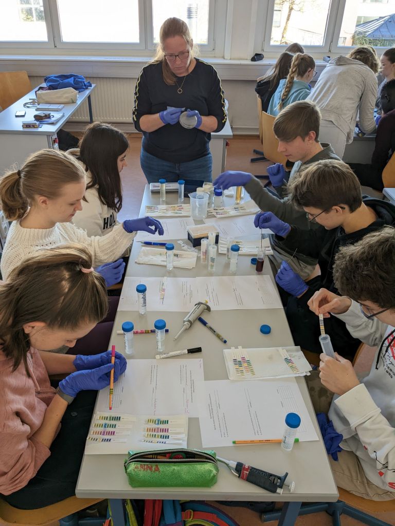 First we gave an introduction to the topic of bacteria, what they are and their importance for the environment and for us. The students knew already a lot and contributed their knowledge. Afterwards they worked in two groups, one looked at the agar plates from the first workshop and the others handled the water samples, which they had brought. On the agar plates with drinking water they spot some bacterial colonies. That’s o.k., drinking water contains bacteria, considering the 1,5 kg microorganisms in each human body, it is not so astonishing. On the agar plates with disinfectants and Vodka 😉 no colonies could be detected. We had led also agar plates open in the classroom, on them nicly colored colonies from air bacteria and mold cultures could be seen. Working with the individual water samples was due to the practice of the first workshop quiet easy. We are very curious what will grow on these plates from the students.