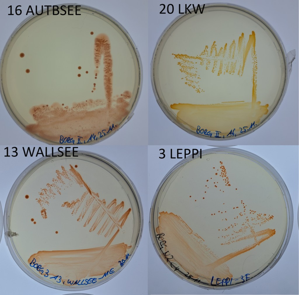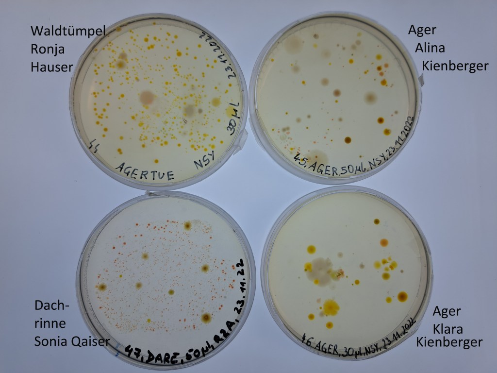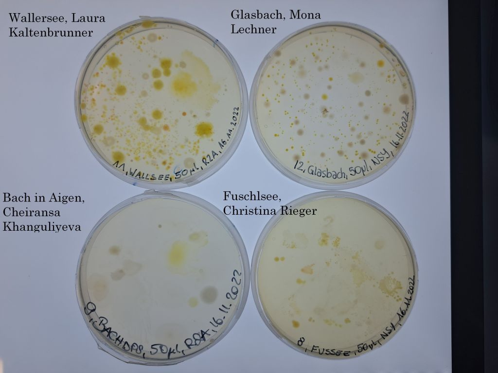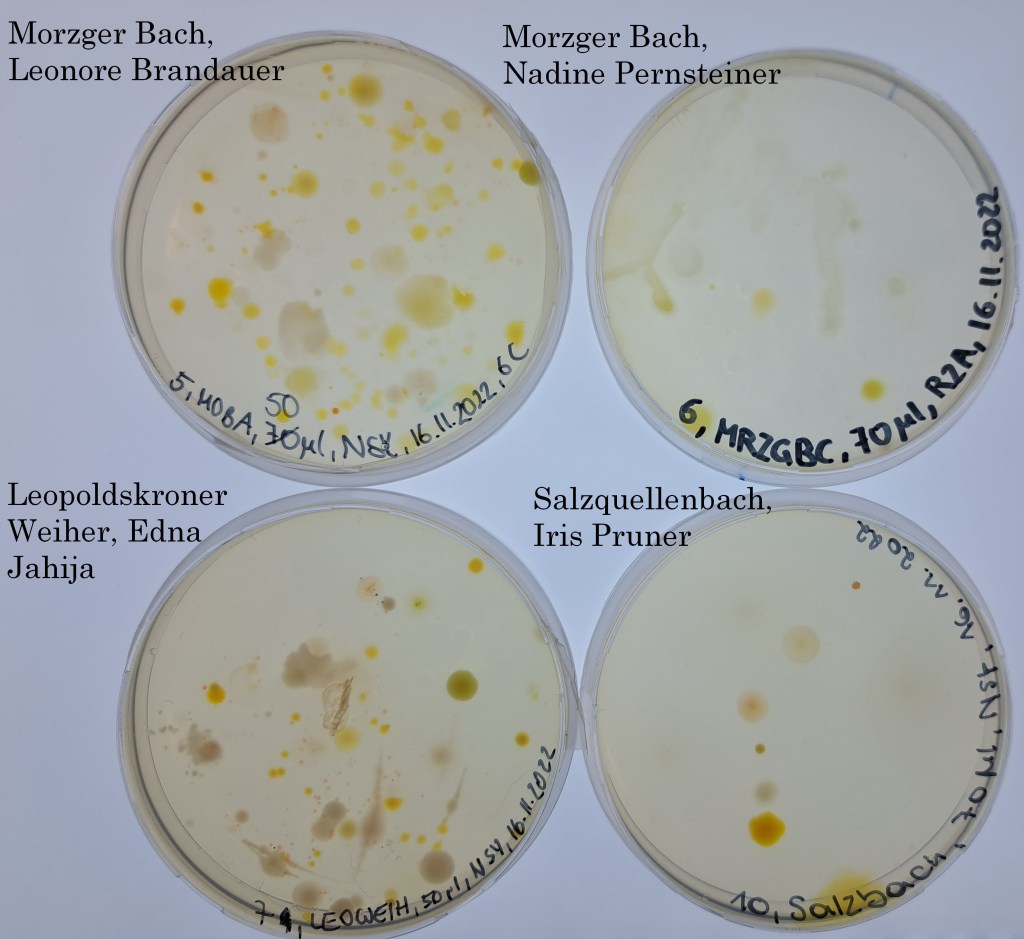 The students from the two schools BORG Nonntal and BRG Schloss Wagrain had brought water samples from different water habitats and spread them on agar plates. After two weeks of incubation in the lab a lot of bacterial colonies appeared, as you can see on the photos.
