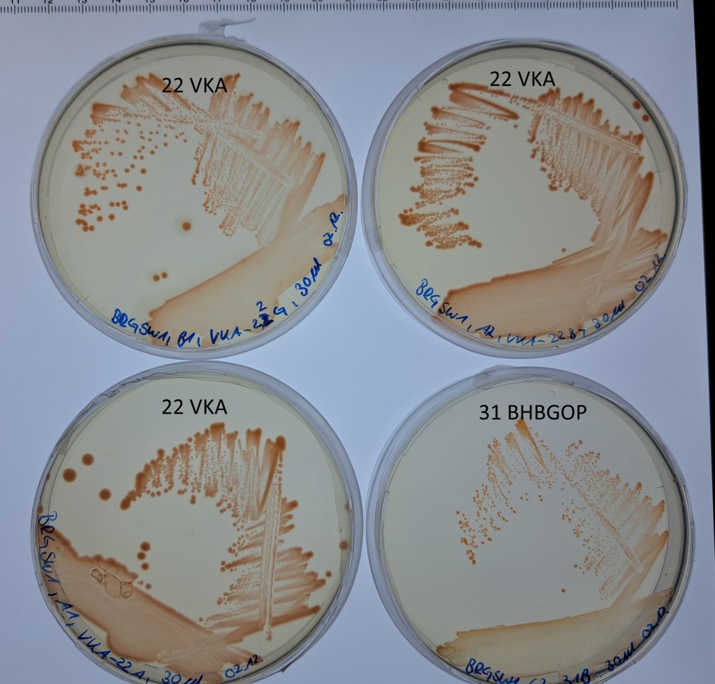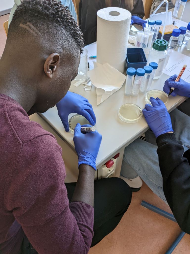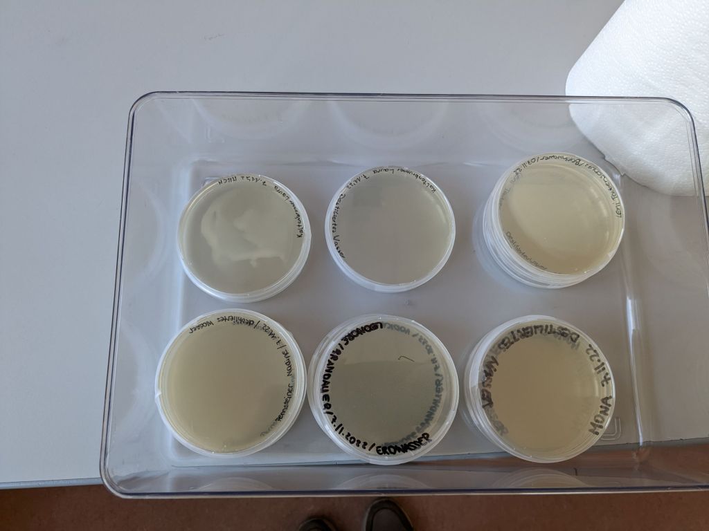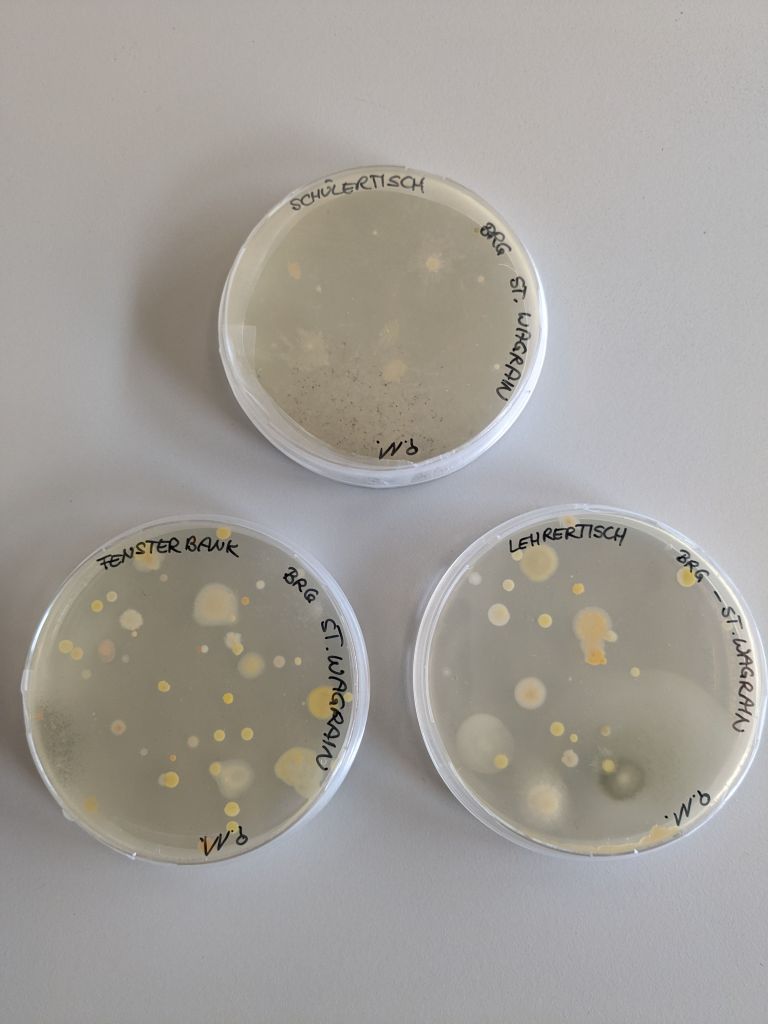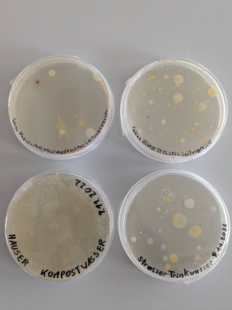 The students from the two schools BORG Nonntal and BRG Schloss Wagrain had brought water samples from different water habitats and spread them on agar plates. After two weeks of incubation in the lab a lot of bacterial colonies appeared, as you can see on the photos.