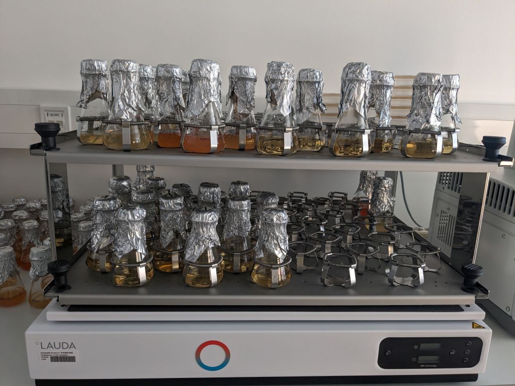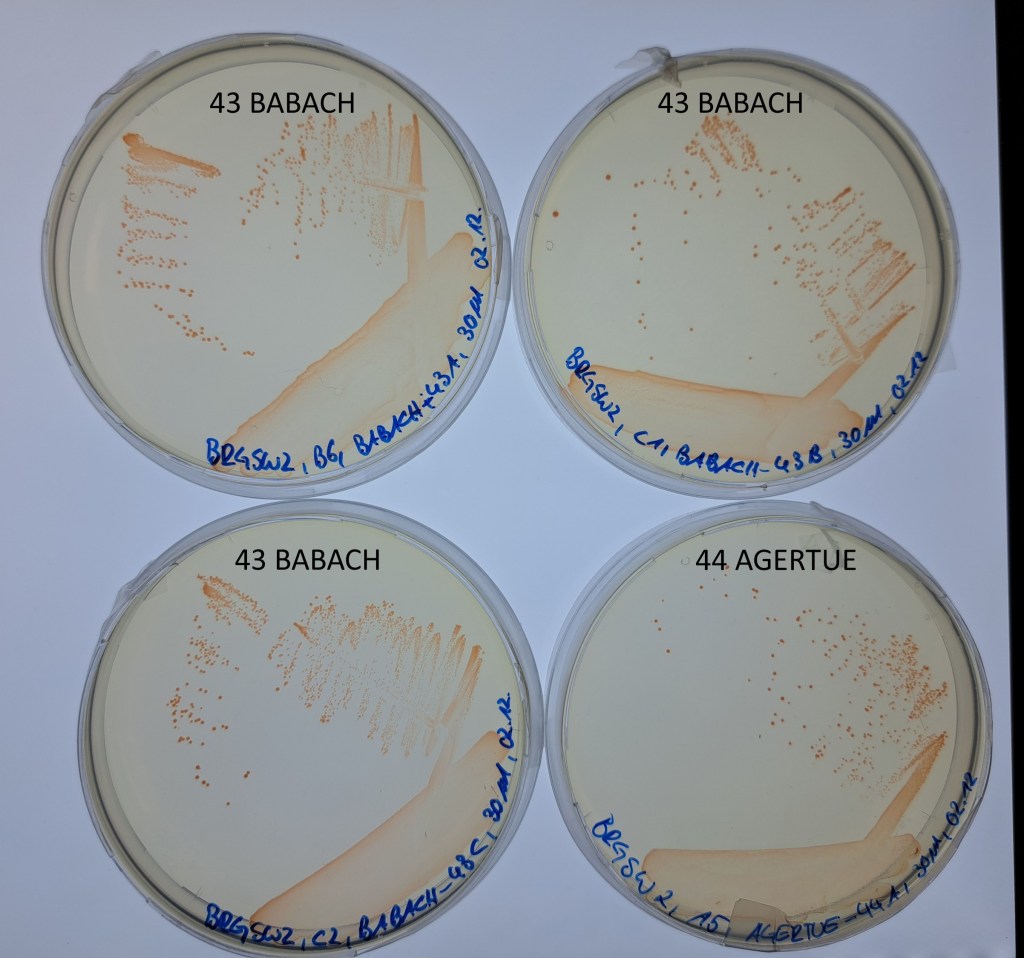 In lab we selected the promising colonies with the typical ‚Aquirufa red‘ and brought them into liquid medium. These liquid cultures were spread again on agar plates, some of them can be seen on the pictures:
