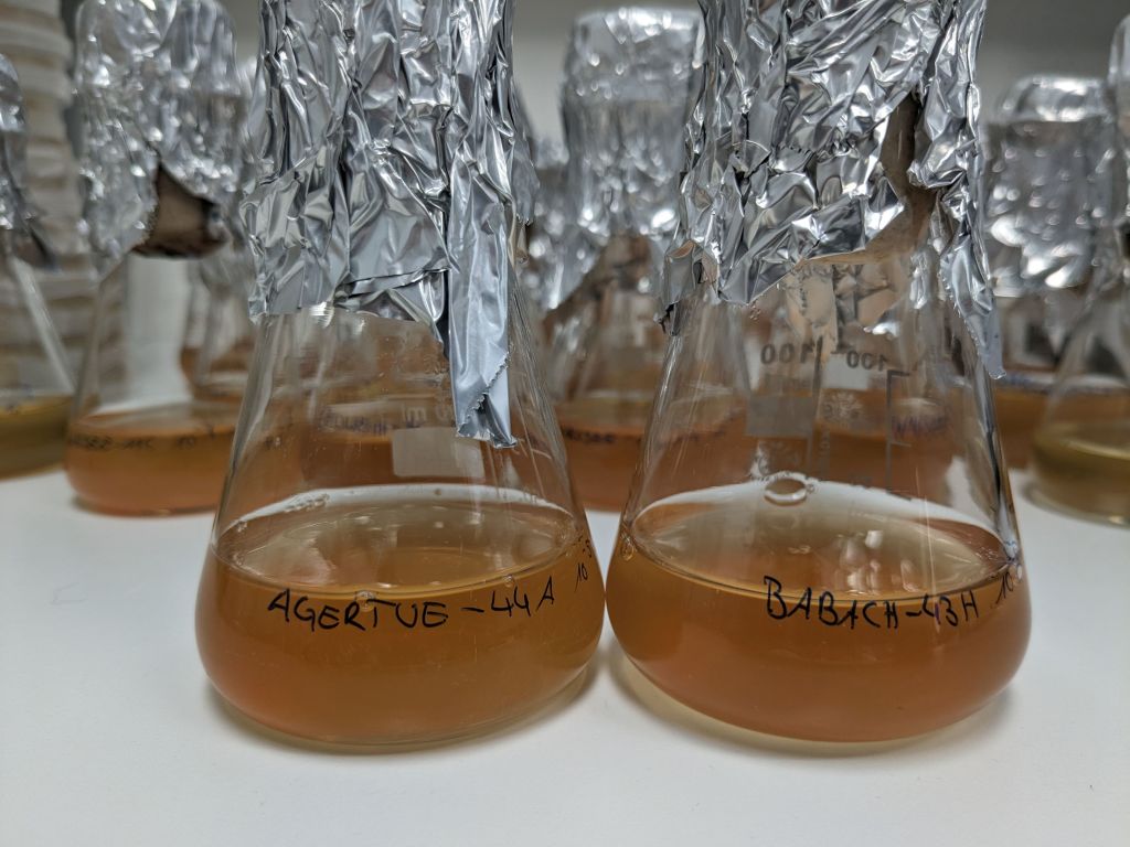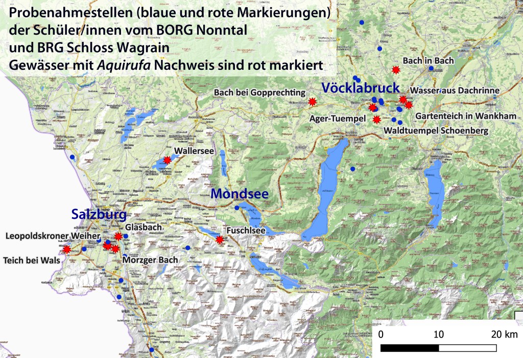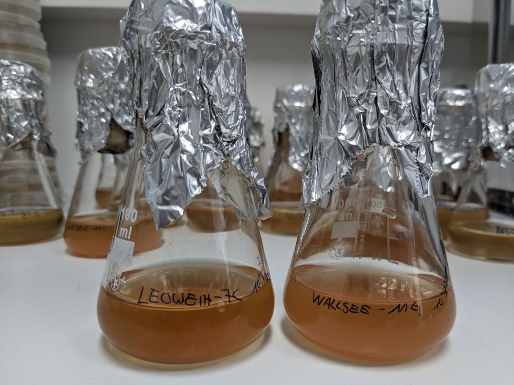 The collaboration with the two school classes (BORG Nonntal and BRG Schloss Wagrain) resulted in a lot of bacterial isolates. The cultures grow now on agar plates and in liquid media. With PCR and sequencing of parts of two genes more than 25 strains could be assigned to the target genus Aquirufa. The students and the project team could isolate strains of Aquirufa from 13 water samples of in total 43 samples. This corresponds to 30 % and is a really astonishing portion. It confirmed the impression, that Aquirufa is a widespread group in the surrounding waters. These are the 13: Leopoldskroner Weiher LEOWEIH-7 (Edna Jahija) and LEPPI-3 (Ioanna Polo), WALLSEE-11 (Wallersee, Laura Kaltenbrunner), FUSSEE-8 (Fuschlsee, Christina Rieger), WAEICH-18 (forest pond, Martin Windberger), GLASBACH-12 (Glasbach, Mona Lechner), MRZGBC-6, (Morzger Bach Nadine Pernsteiner), BHBGOP-31 (creek near Gopprechting, Hannah Stockinger), GARBAGER-33 (Ager, Julia Schiller), BABACH-43 (creek at Bach 😉 Martha Wohlschläger), AGERTUE-44 (Ager pond, Ronja Hauser), WATS-35 (a forest pond Schönberg, Kilian Ponget) and DARE-47 (rain water, Sonia Qaiser). From 11 isolates we will sequence the whole genomes to decide which of them represent a new species. They originate from: WALLSEE, LEOWEIH, LEPPI, FUSSEE (if the strain corporates 😉 ), WAEICH, DARE, WATS, BHBGOP, BABACH and GARBAGER.