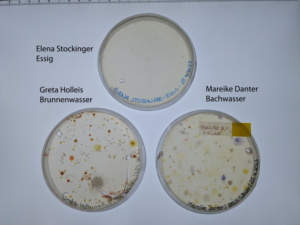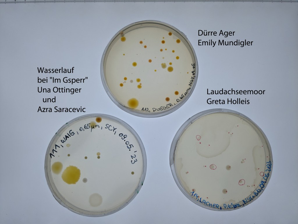 Jede Schülerin und jeder Schüler hatte eine Wasserprobe von einem Gewässer seiner Wahl mitgebracht, diese filtriert und auf Agarplatten mit unterschiedlicher Zusammensetzung ausgestrichen. Die Platten von Greta und Mareike vom ersten Workshop hatten schon vielversprechende Kolonien, da hat Johanna wie auch von der ‚Essigplatte‘ von Elena gleich Kolonien aus dem Agar ausgestochen (auf dem ersten Foto zu sehen). Wir haben von den Agarplatten vom zweiten Workshop jeweils ein Exemplar fotographiert. Manche brauchen noch etwas Zeit, aber auf einigen haben wir schon typische ‚Aquirufa-rote‘ Kolonien entdeckt 🙂 . Beim Laudachseemoor von Greta haben wir noch nichts rotes entdeckt (das sind nur Johannas Markierungen 😉 ), dafür aber andere für uns spannende Bakterien.