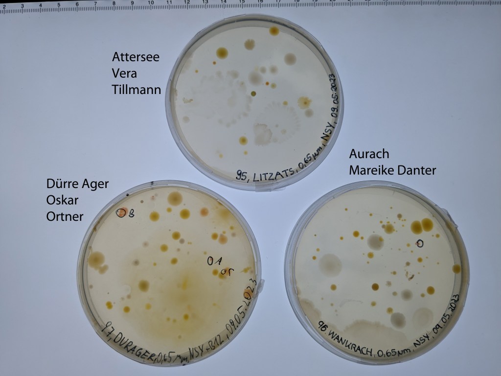 Und das sind die Gewässer, aus denen wir bis jetzt Aquirufa-Kulturen erhalten haben: Vöckla (VOEKFU-92, Isabella Kammerer), Griebach/Neudorfer Bach in Rutzenmoos (GRIRUBA-93, Christina Kroismayr), Aurach (WANKRACH-96, Mareike Danter), Dürre Ager (DURAGER-97, Oskar Ortner), Teich in Friesam (FRTEICH-102, Xaver Golmayer), Vöckla (VOEKLAB-107, Matthias Reiterer), Dürre Ager (DUEGER-112, Emily Mundigler).
