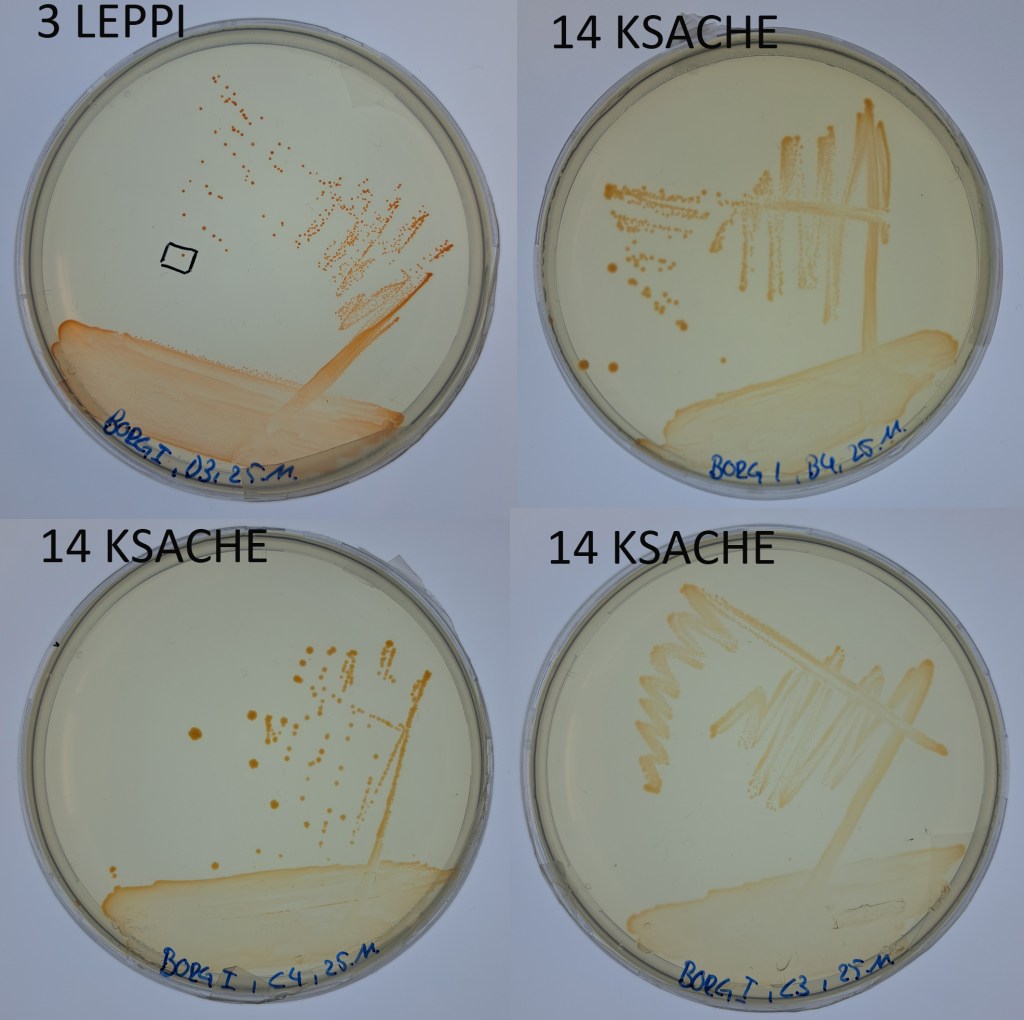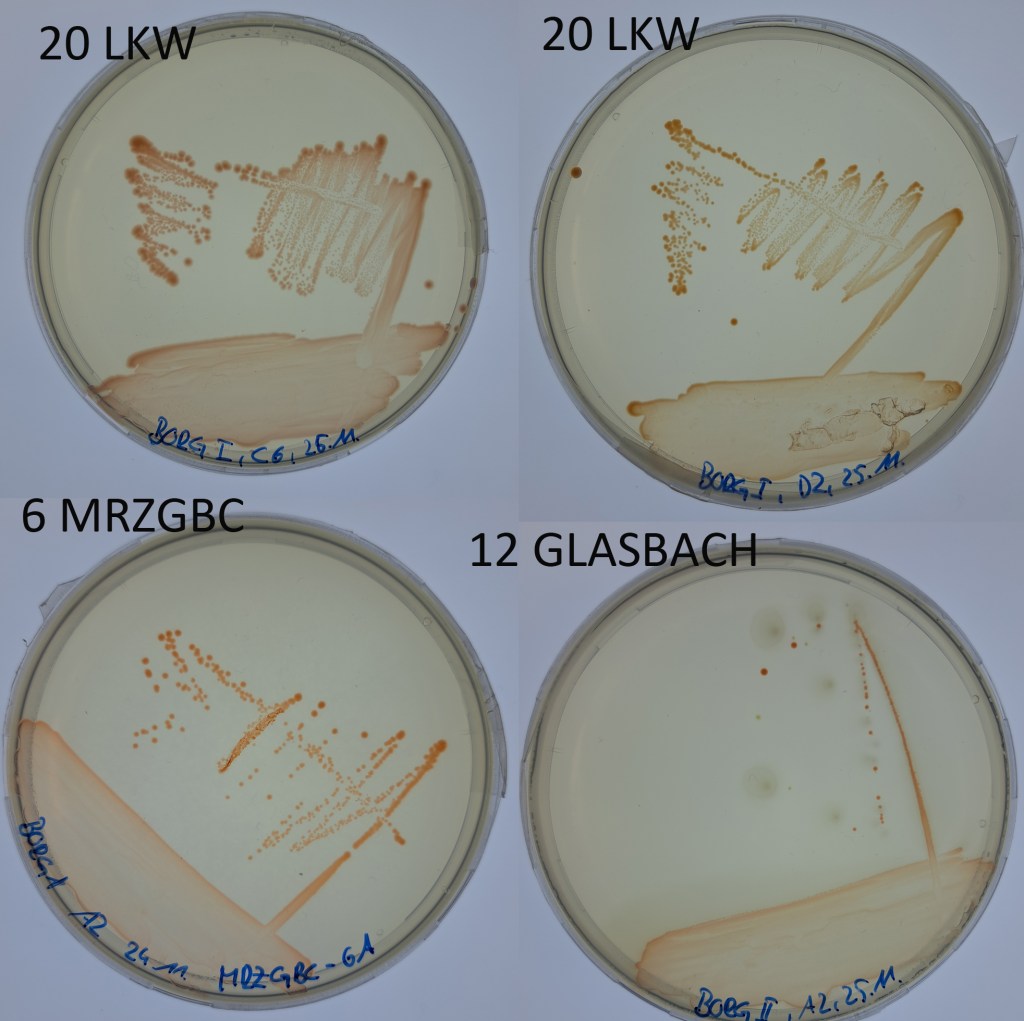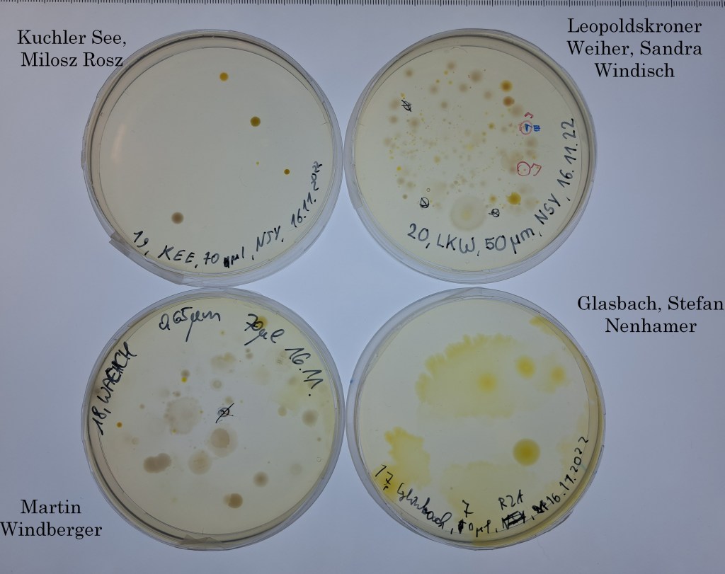 Die Schüler/innen hatten Proben von verschiedenen Gewässern mitgebracht, gefiltert und auf Agarplatten ausgestrichen. Nach zwei Wochen bei uns im Labor waren darauf einige interessante Kolonien gewachsen. Stefan hat eine Platte von jeder Schülerin und jedem Schüler fotografiert: