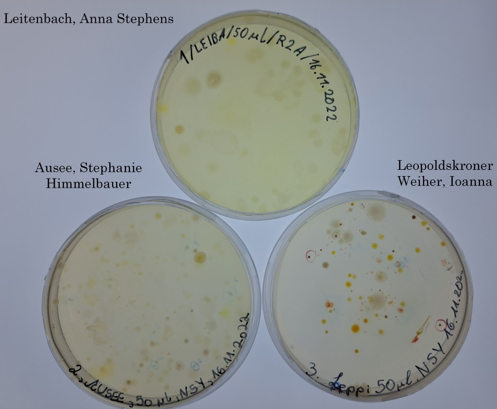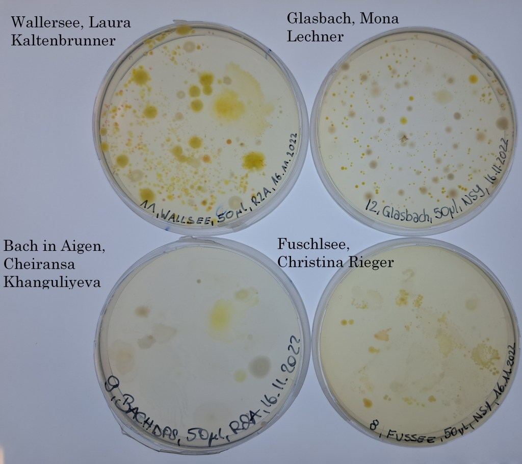 Aus diesen von den Schüler/innen selbstausgewählten Gewässern konnten wir von den im Klassenzimmer bearbeiteten Agarplatten Aquirufa Bakterienstämme isolieren: Leopoldskroner Weiher aus zwei Proben LEOWEIH-7 (Edna Jahija) und LEPPI-3 (Ioanna Polo), Wallersee (WALLSEE-11, Laura Kaltenbrunner), Fuschlsee (FUSSEE-8, Christina Rieger), ein namenloser Waldtümpel (WAEICH-18, Martin Windberger), Glasbach (GLASBACH-12, Mona Lechner) und Morzger Bach (MRZGBC-6, Nadine Pernsteiner).