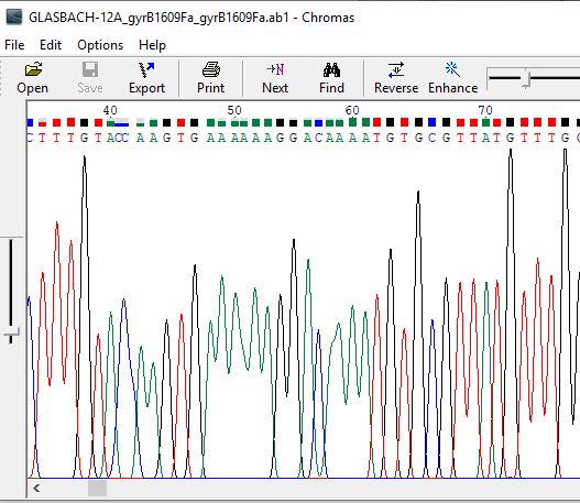 Man erhält nun für jede Probe eine ‚Sequenz‘ das ist nichts anderes als eine Abfolge der Buchstaben A, T, C und G. Für unseren GLASBACH-12 sieht das dann so aus: ein grüner Peak bedeutet A, ein roter T, ein schwarzer T und ein blauer C. Ein paar hundert Buchstaben bekommen wir so für jeden Stamm.