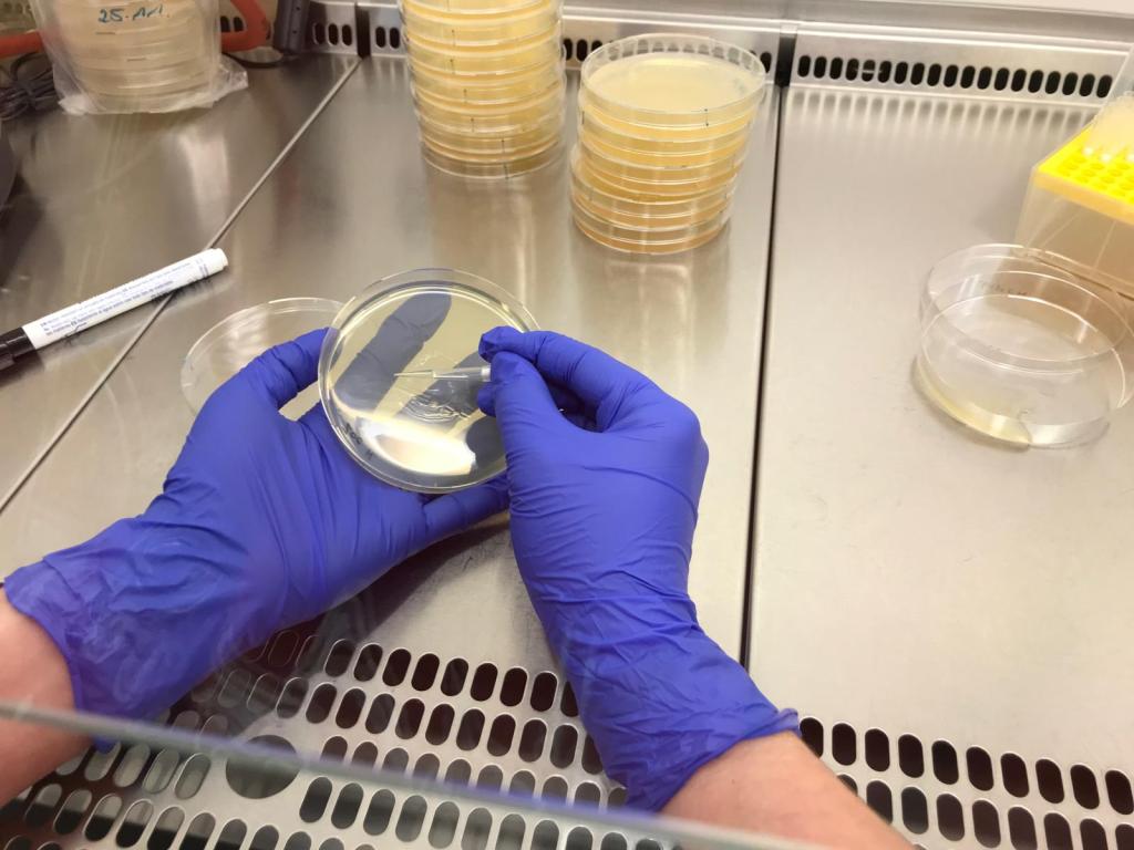 Von den Agarplatten haben wir uns die Kolonien rausgesucht, die das typische ‚Aquirufa-Rot‘ zeigen. Von diesen haben wir mit einem (sterilisierten 😉 ) Zahnstocher ganz vorsichtig in ein bisschen flüssiges Medium gegeben. Dort konnten sich die Bakterienzellen weiter vermehren. Wenn die Flüssigkultur wieder das typische Rot aufwies, haben wir davon wieder ein wenig auf eine Agarplatte pipettiert und mit einer Impföse (das sind die langen Stäbe im 1. Bild) verteilt. Dabei streicht man die Kultur so aus, dass man flächiges Wachstum, aber auch einzelne Kolonien bekommt. Einige dieser Platten sehen schon jetzt sehr vielversprechend aus. Ein paar Fotos davon gibt es hier: