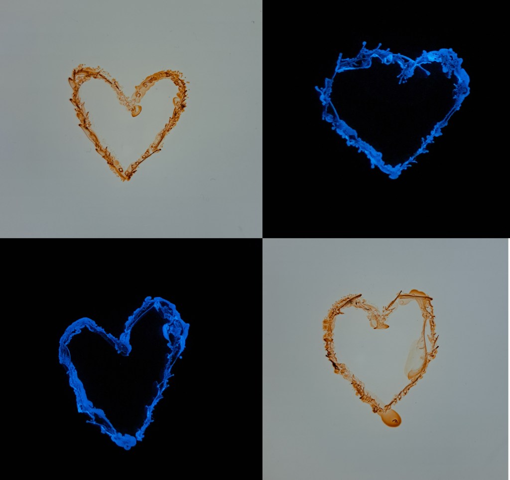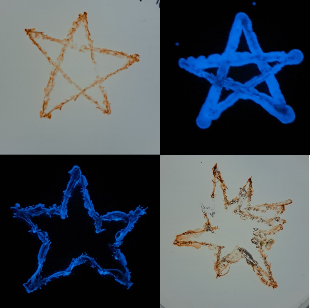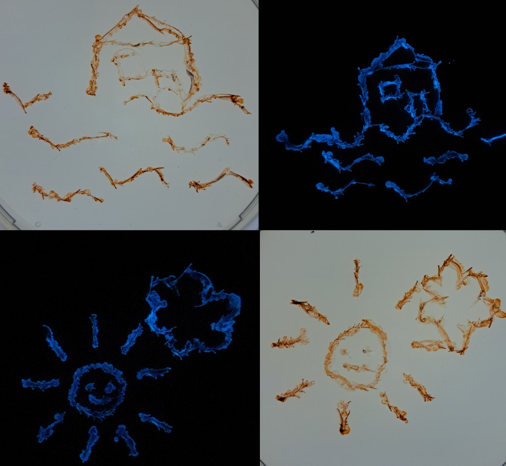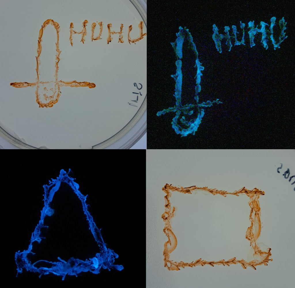 Hier sind die Kunstwerke der Klasse. Die Schüler/innen hatten bei ihrem Besuch bei uns auf Agarplatten mit Aquirufa Bakterien und Leuchtbakterien gemalt.