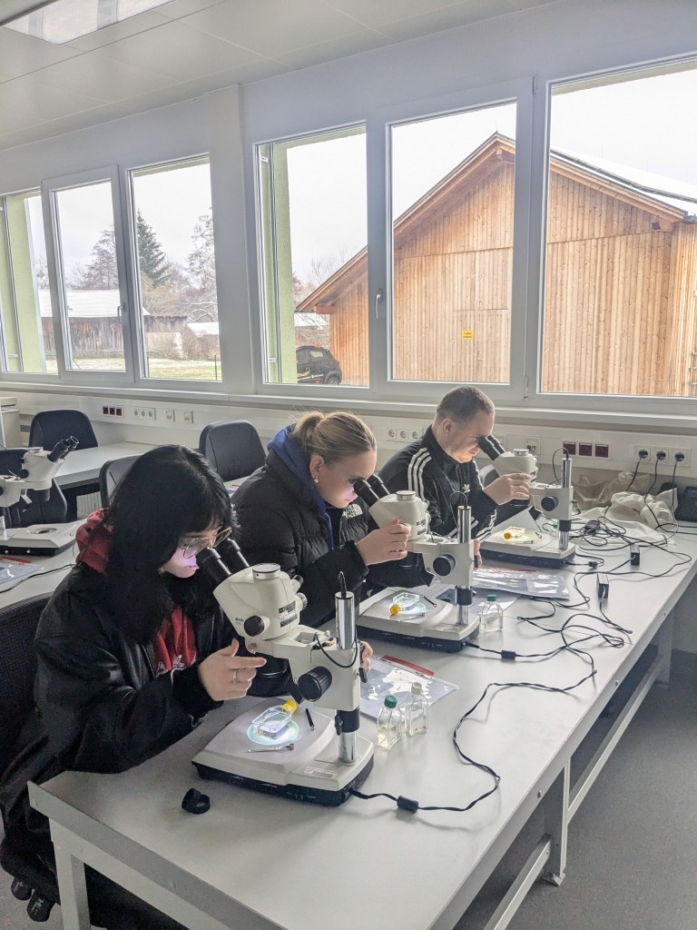Im Januar 2025 war die Klasse mit ihrem Lehrer Markus Herbst bei uns in Mondsee zu Gast. Inzwischen sind die Schüler/innen in der 8. Klasse und werden bald Matura machen. Sie arbeiten schon seit fast 2,5 Jahren bei uns im Projekt mit und heute war unser letztes Treffen. Die Klasse hat mit Wasserproben, Beimpfen von Agarplatten und Mitarbeit im Rahmen von Sommer Praktika viel zum Projekt beigetragen. Eine wissenschaftliche Veröffentlichung ist dabei bereits herausgekommen und zwei weitere sind schon eingereicht. An Stationen wurde das Institut erkundet. Nur zur Beprobung am Mondsee war es zu kalt, dafür wurde das Bootshaus besichtigt. Zum Schluss gab es Partybrezeln. Die Klasse überreichte uns ein Geschenk und eine sehr liebe Karte. Die Pralinen werden unsere nächste Besprechung versüßen 🙂. Wir wünschen der Klasse alles Gute für die Matura!