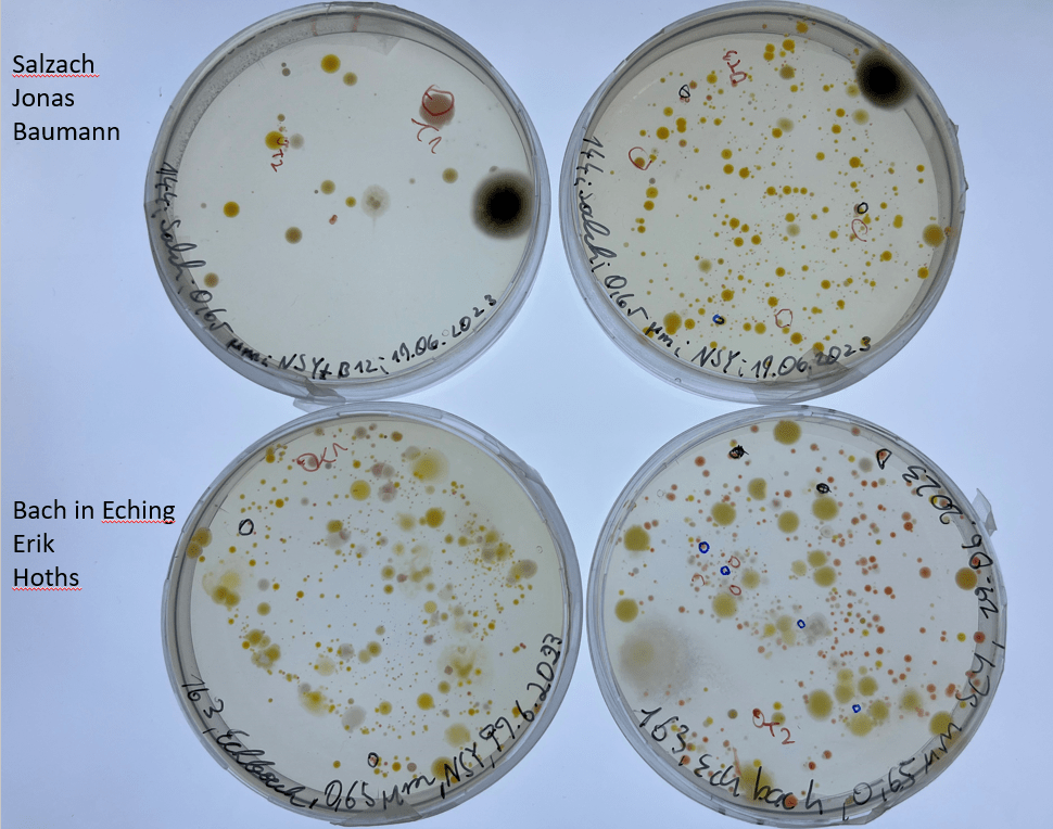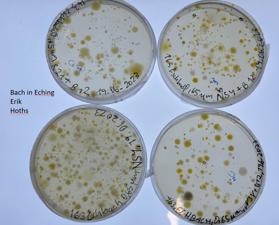 Und das sind die Gewässer, aus denen wir bis jetzt Aquirufa-Kulturen erhalten haben: Teich in Webersdorf (TEIWEDO-141, Elena Lackner), Pladenbach (PLAD-142, Lena Mayrhofer, Laura Gaisböck), Salzach (SALCH-144, Jonas Baumann), Handenberg Tümpel (HATUE-149, Katharina Stöger), kleiner Bach bei Bürmoos (BACHBUER-151, Naomi Mota Shimabukuro), Saaggraben (Wannerdorfer Bach) (SAAGRA-154, Sarah Köckerbauer), Bach in Eching (ECHBACH-163, Erik Koths).