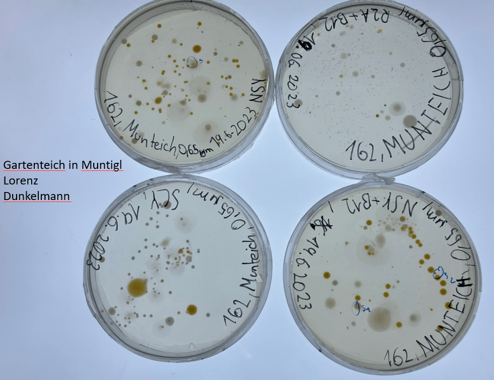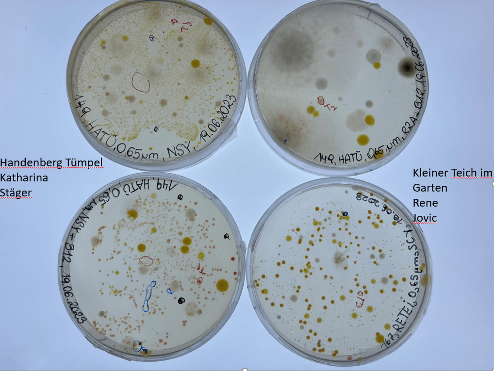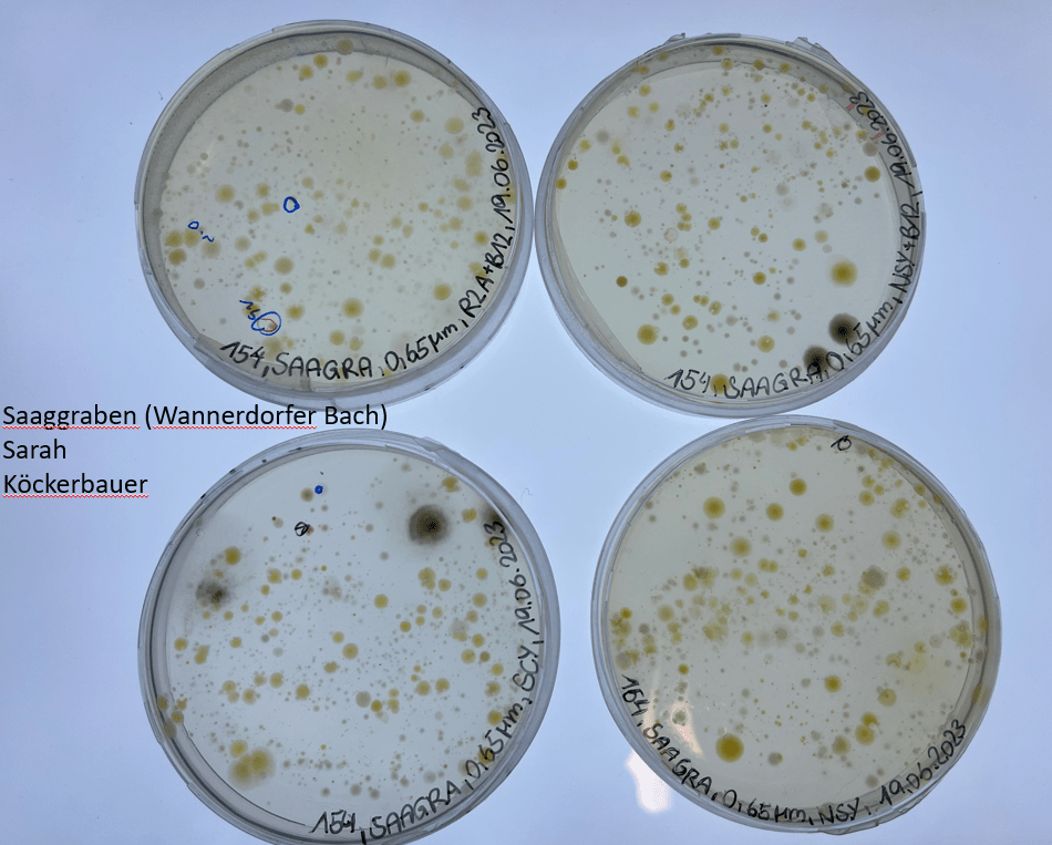 Hier sind Fotos von der von den Schüler/innen mit ihren gesammelten Wasserproben beimpften Agarplatten. Auf manchen Platten haben wir schon interessante Kolonien entdecken können, man erkennt sie an den Markierungen auf dem Boden der Agarplatten. Zum Teil haben uns die Pilzsporen aus der Luft etwas dazwischengefunkt, aber es sind auch viele Platten nicht kontaminiert. Ein Lob an die Schüler/innen, die sich sehr bemüht haben die Deckel nur ganz kurz anzuheben, so dass möglichst wenig aus der Luft darauf fallen konnte. Vielen Dank an unsere Sommerpraktikantin Sophia von der HBLA fürs Fotographieren und Beschriften.