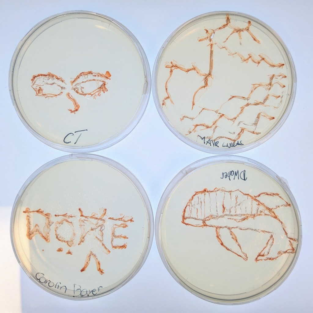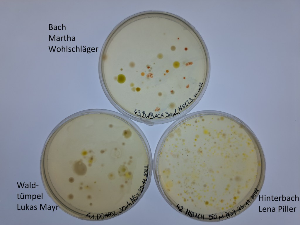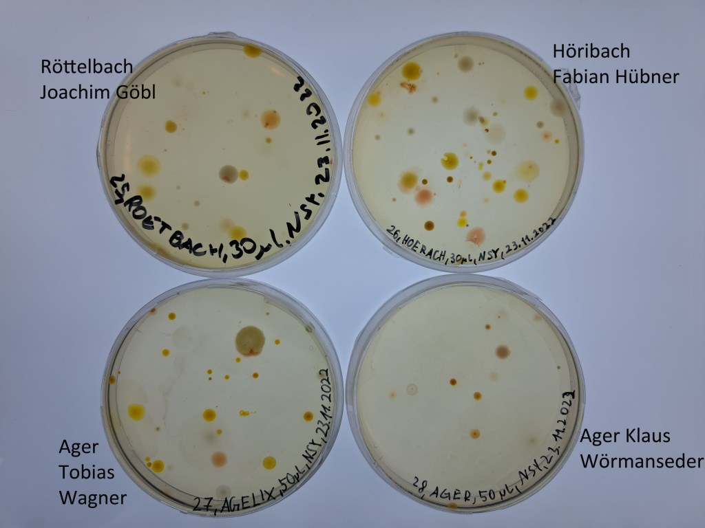 Die Schüler/innen hatten Proben von unterschiedlichen Gewässern mitgebracht, sehr beliebt war die Ager und die Vöckla. Für uns sind die Proben sehr interessant, weil wir aus dieser Gegend noch gar keine Proben haben. Das Wasser wurde gefiltert und auf Agarplatten ausgestrichen. Nach zwei Wochen bei uns im Labor war darauf schon einiges gewachsen. Stefan hat eine Platte von jeder Schülerin und jedem Schüler fotografiert: