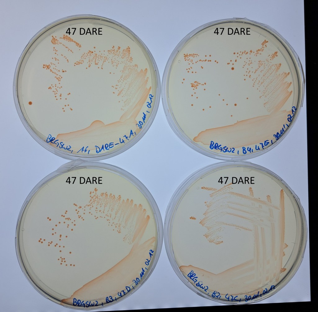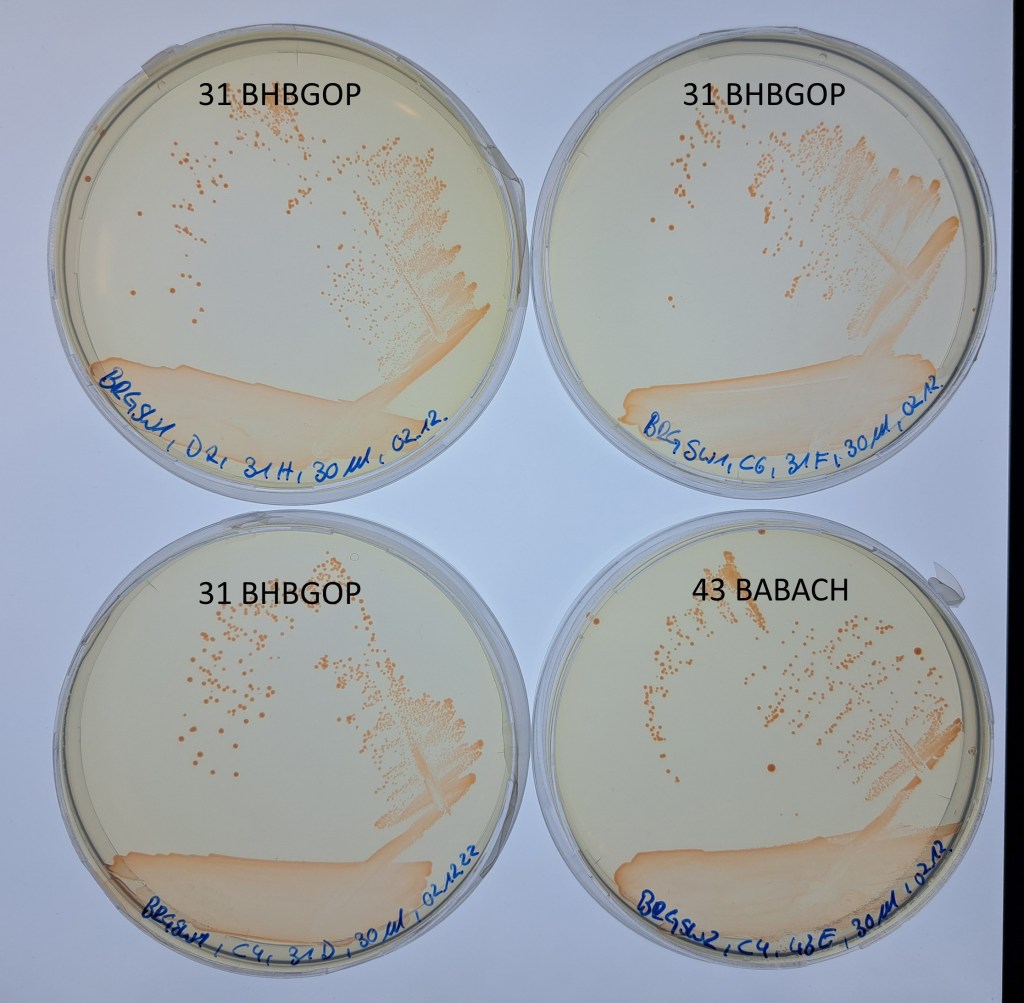 Aus diesen von den Schüler/innen selbstausgewählten Gewässern konnten wir aus den im Klassenzimmer bearbeiteten Agarplatten Aquirufa Bakterienstämme isolieren: BHBGOP-31 (Bach bei Gopprechting, Hannah Stockinger), GARBAGER-33 (Gartenteich 🙂 , Julia Schiller), BABACH-43 (Bach bei Bach 😉 Martha Wohlschläger), AGERTUE-44 (Ager Tümpel, Ronja Hauser), WATS-35 (Waldtümpel Schönberg, Kilian Ponget) und DARE-47 (Wasser aus Dachrinne, Sonia Qaiser).