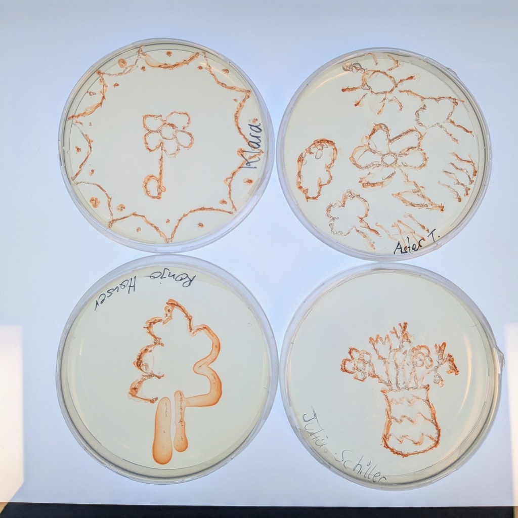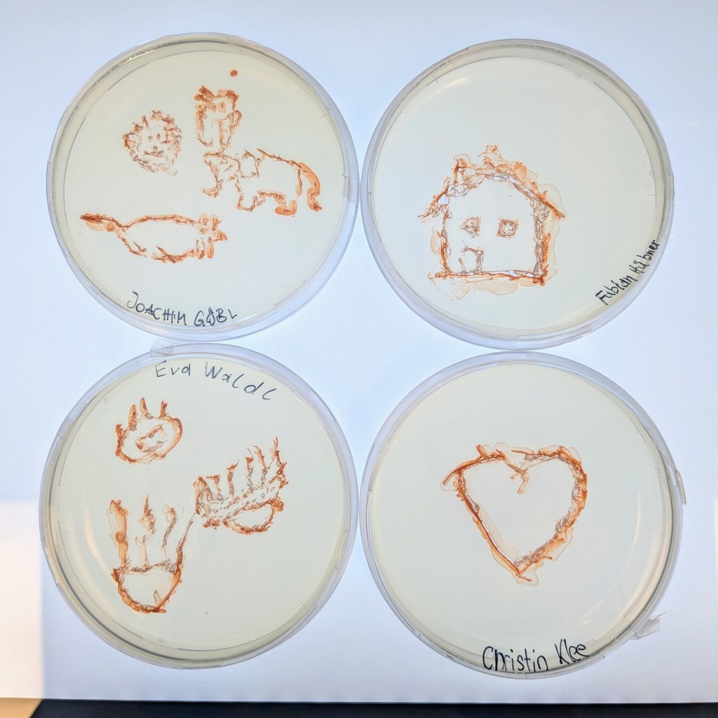 Gleich nach Ostern 2025 war die Klasse zu uns am Forschungsinstitut in Mondsee zu Besuch. Inzwischen sind über zwei Jahre seit dem ersten Workshop vergangen. Durch die Mitarbeit der Klasse sind wir mit unserer Forschung ein ganzes Stück weitergekommen. Aus den im zweiten Workshop angelegten Bakterienkulturen konnten wir einige Bakterienstämme unserer Aquirufa Bakterien gewinnen. Die Daten dazu sind in eine wissenschaftliche Publikation eingeflossen (siehe oben). Nun wollen wir eine Methode entwickeln, mit der wir die einzelnen bekannten und auch noch unentdeckten Aquirufa Arten direkt aus einer Wasserprobe anhand der darin enthaltenen DNA nachweisen wollen. Bis jetzt klappt das noch nicht sehr gut, aber wir sind zuversichtlich. Dann werden auch die mit der Klasse genommenen Wasserproben aus Ager und Vöckla ausgewertet. Wir sind schon gespannt! An verschiedenen Stationen wurde das Institut erkundet. Mit einer Aquirufa Kultur wurde auf Agarplatten gemalt, die Kunstwerke sind unten in der Galerie zu sehen. Zum Schluß gab es noch eine gemeinsame Jause und zur Erinnerung wurde ein Gruppenfoto gemacht. Wir wünschen der Klasse und ihren Lehrer/innen alles Gute und halten sie über den Fortgang des Projektes auf dem Laufenden.