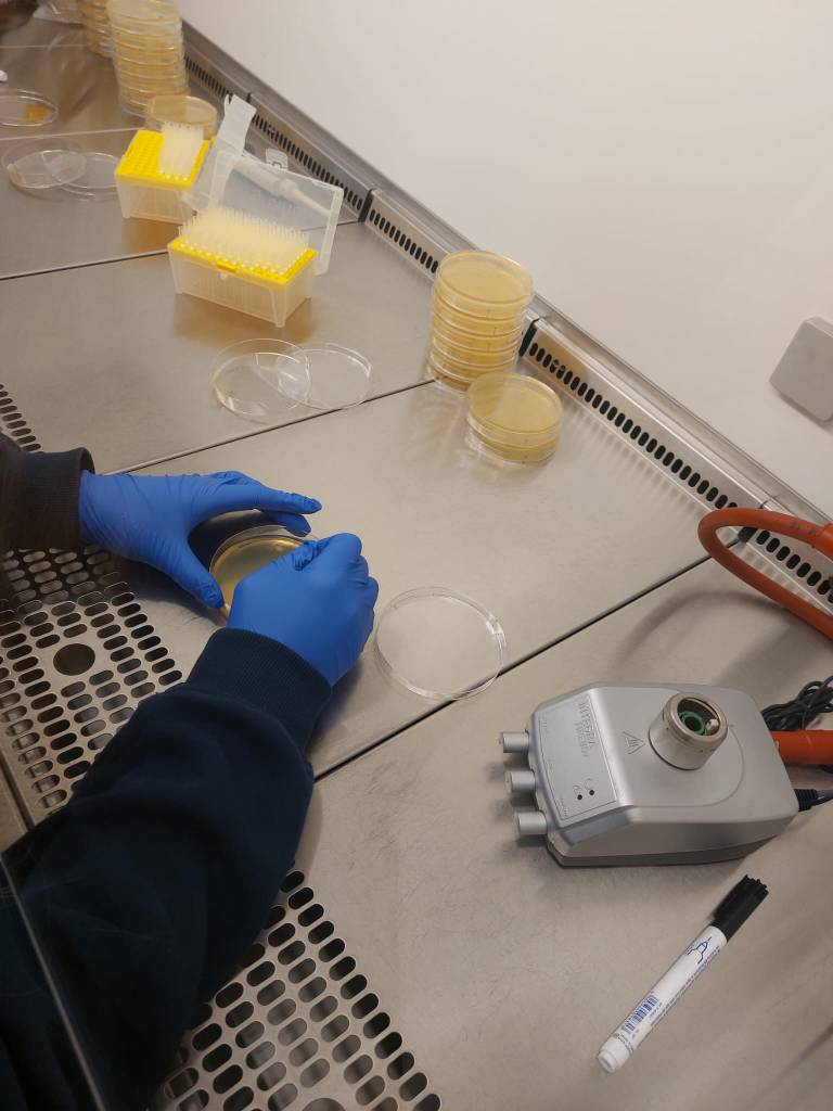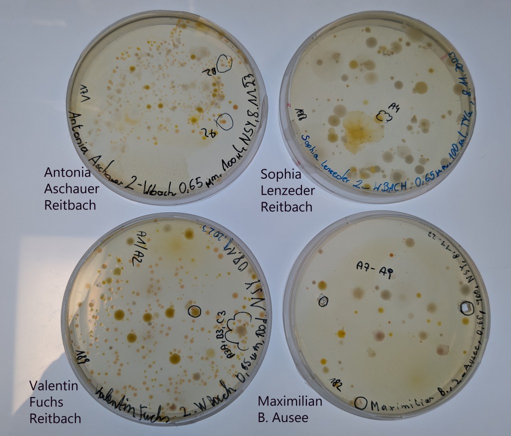 Am 12.7.2023 waren wir mit drei Schülerinnen (Zoe, Lucie und Anna) vom BORG Nonntal, die bei uns ein Sommerpraktikum machen, in der Weitwörther Au. Wir haben den Ausee, die Salzach, ein neu angelegtes stehendes Gewässer und einen kleinen Bach beprobt. Ausserdem haben wir Leitfähigkeit, pH-Wert, Sauerstoffgehalt und die Temperatur in den Gewässern gemessen. Das Wasser im Aussee hatte 25 °C, ganz schön warm. Wieder zurück im Labor haben sich Zoe, Lucie und Anna gleich daran gemacht, die Wasserproben zu filrieren und auf verschiedene Agarplatten auszustreichen. Nächste Woche werden wir sehen, ob da unsere Aquirufa Bakterien wachsen. Außerdem haben wir Wasser auf Filter filtriert und diese dann eingefroren. Das hat ganz schön lange gedauert, da das Wasser zum Teil recht trüb war. Von den Filtern werden wir im nächsten Teil des Projektes die Erbsubstanz aus den Wasserproben gewinnen, um damit analysieren zu können, welche Aquirufa Arten nun wirklich in den Gewässern leben. Bis dahin ist es noch ein weiter Weg.