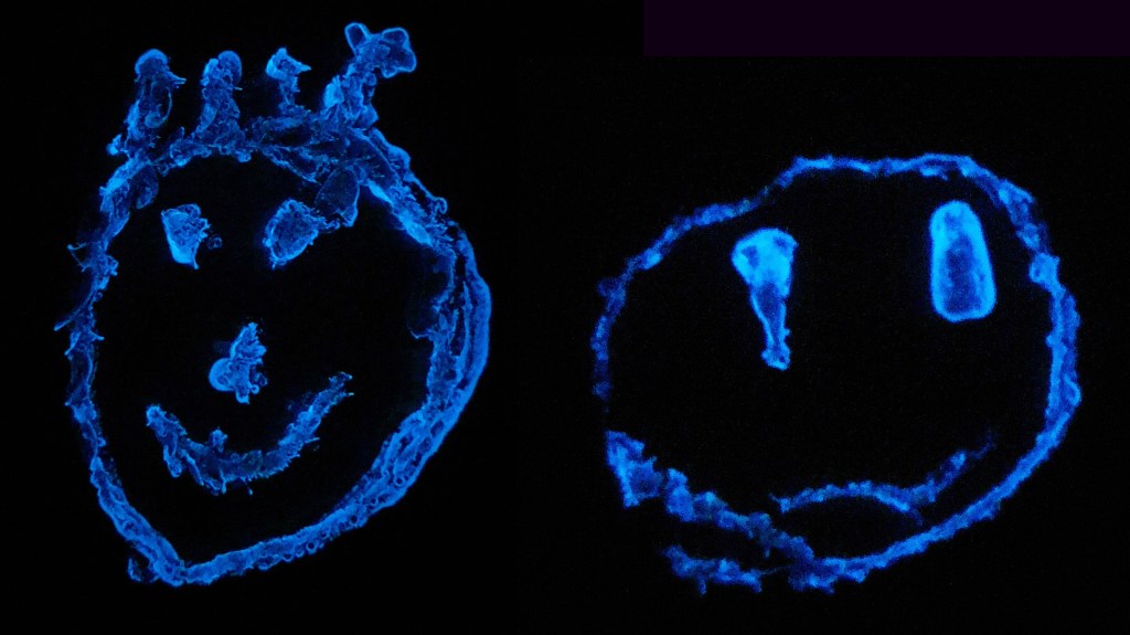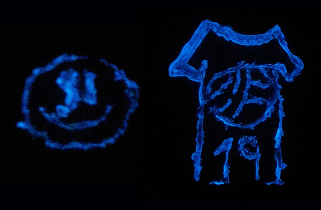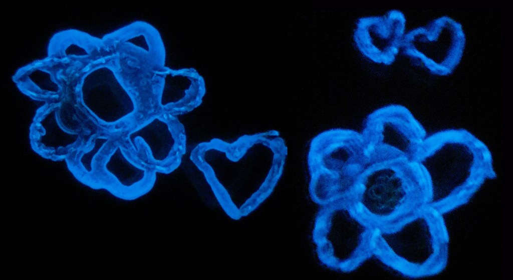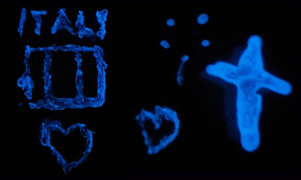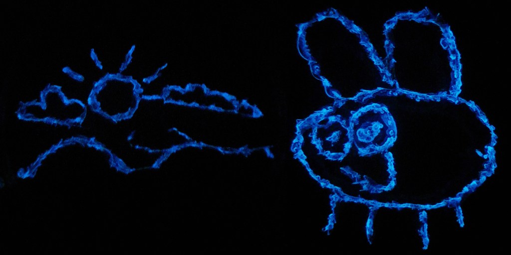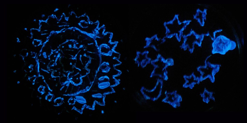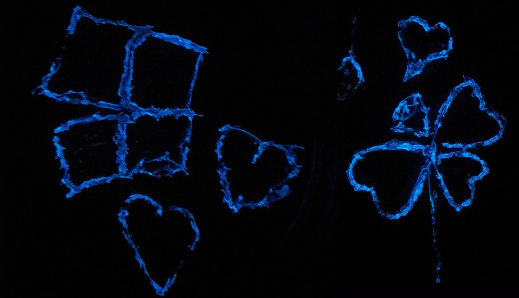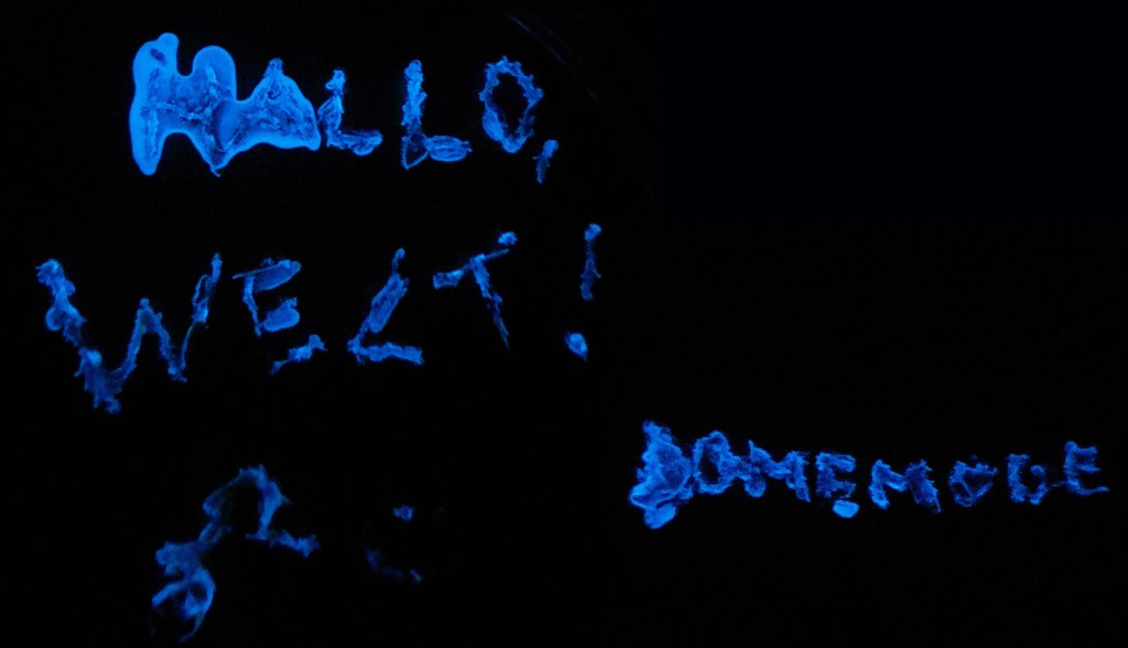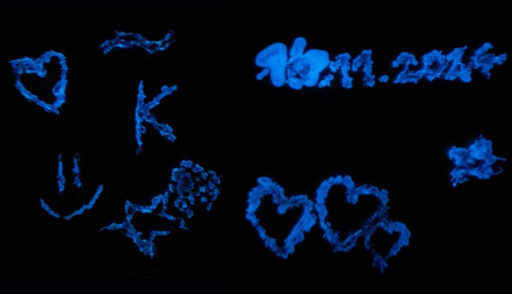Hier sind die wirklich tollen Kunstwerke der Klasse. Die Schüler/innen haben mit Leuchtbakterien auf Agarplatten gemalt. Schon nach einem Tag konnte man im Dunkeln die Bakterien leuchten sehen. Stefan hat sie im Dunkeln fotographiert hier auf den Fotos haben wir immer zwei zueinander passende Bilder zusammengefügt.