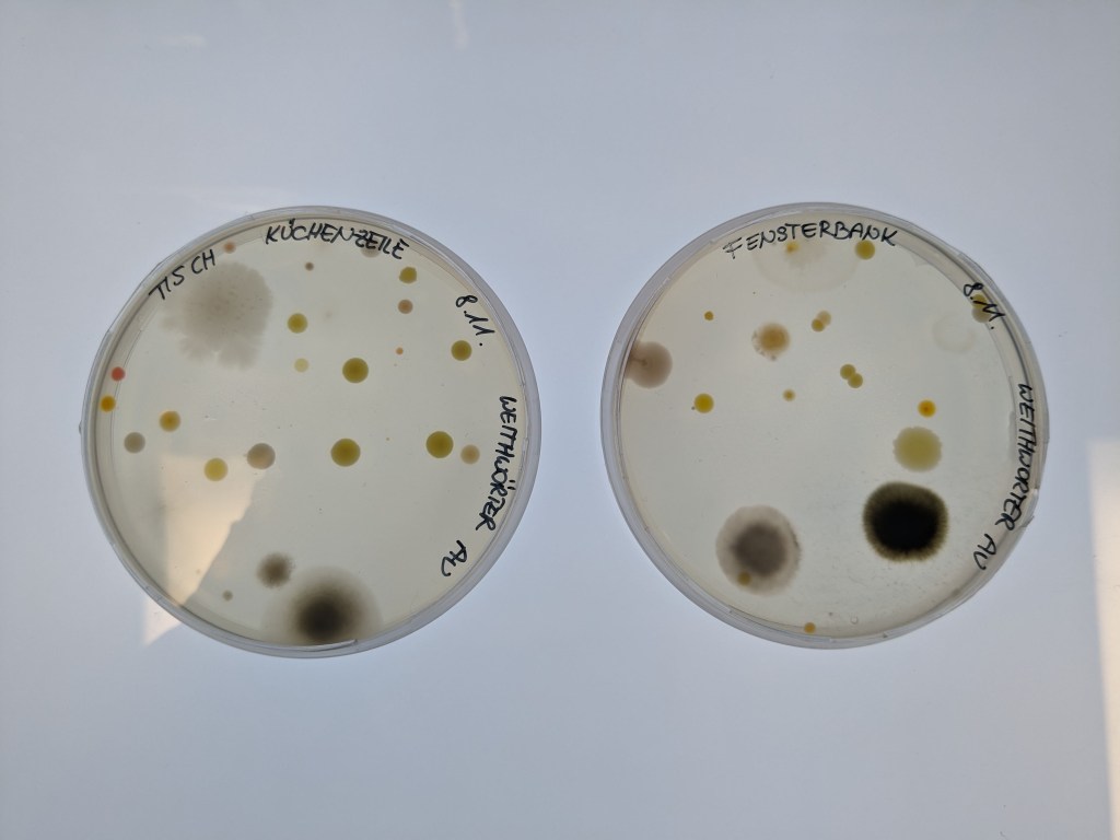 Inzwischen sind auf den Agarplatten der Schüler/innen schon viele Bakterienkolonien gewachsen. Für uns sehr überraschend waren auch viele rote Kolonien dabei, die verdächtig nach Aquirufa Bakterienstämmen aussehen. Inzwischen haben wir schon fleissig versucht Bakterienstämme davon zu isolieren, man sieht es an den Markierungen auf den Agarplatten. Aus den Proben vom Sommer konnten wir bis jetzt nur aus der Salzach Aquirufa Bakterien kultivieren, aber mit den Herbstproben werden weitere Gewässer in der Weitwörther Au hinzukommen. Auf den Agarplatten, die wir in der Auenwerkstatt ausgelegt hatten, ist auch so einiges gewachsen. Man sieht die kräftig gefärbten Luftkeime (Bakterien), aber auch Schimmelkolonien sind dabei. Das ist nicht weiter bedenklich, ein paar Schimmelsporen sind immer in der Luft. Auf den Agarplatten der Schüler/innen haben wir fast keine Schimmelkolonien entdeckt. Das bedeutet, sie haben sehr sauber gearbeitet und die Deckel immer nur ganz kurz angehoben.