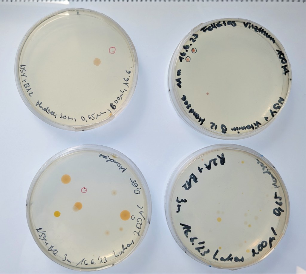 Auf den Agarplatten, die mit Mondseewasser aus verschiedenen Tiefen behandelt wurden, haben wir schon einige typisch rote Kolonien entdeckt, z.B. aus 3m Tiefe (Lukas Moravec) und auch aus 11m Tiefe (Felicitas Vitzthum). Eine Kultur konnten wir schon gewinnen, es ist ein Stamm von Aquirufa antheringensis.