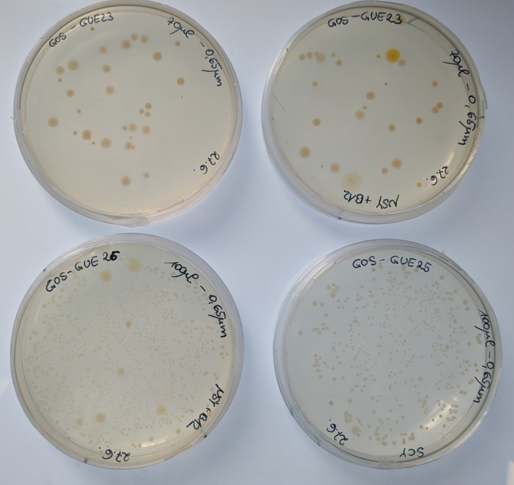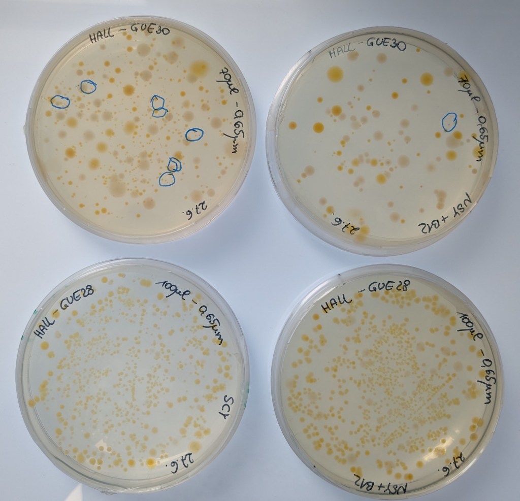 Florian Wolff hat uns aus dem Gosausee und aus dem Hallstättersee Proben von Tauchgängen mitgebracht. Wir haben die Wasserproben filtriert und dann verschiedene Agarplatten damit beimpft. Auf den Agarplatten vom Hallstättersee haben wir schon interessante rote Kolonien entdeckt, man sieht es an den blauen Markierungen.