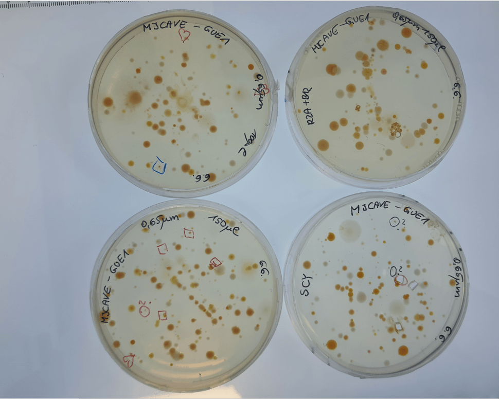 Und so sehen die mit dem Höhlenwasser beimpften Agarplatten aus (man sieht an den Markierungen, dass wir damit gearbeitet haben 😉 )